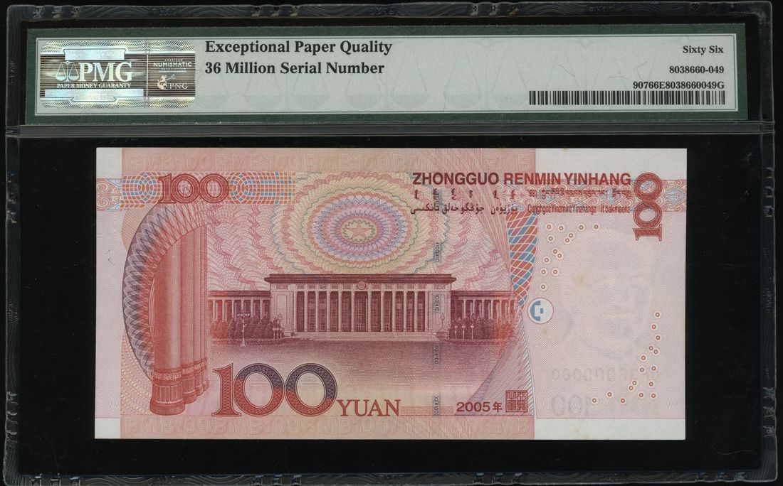 People's Bank of China, 5th Series Renminbi, 2015, 100 yuan, serial number OF36000000, (Pick 909), PMG 66EPQ