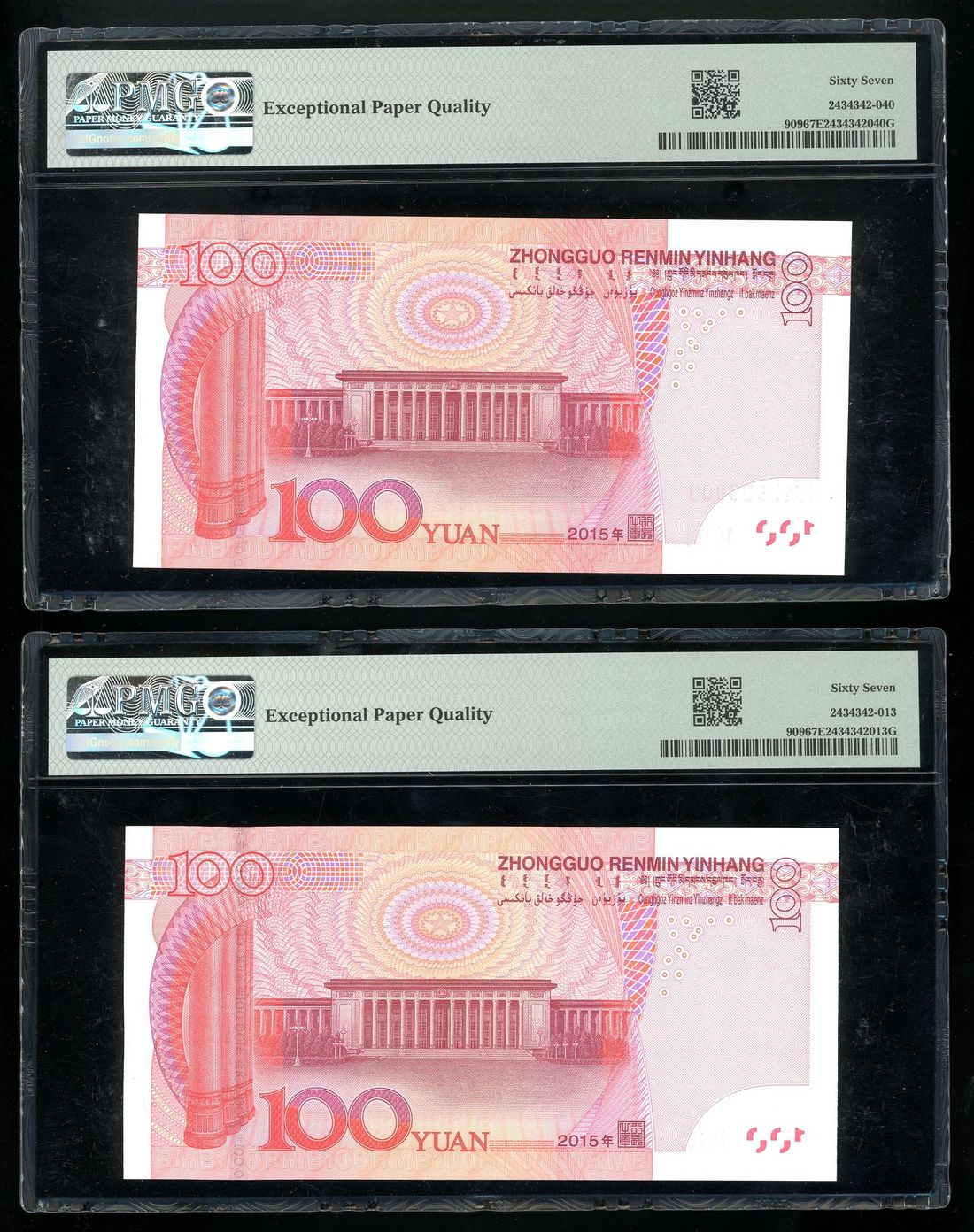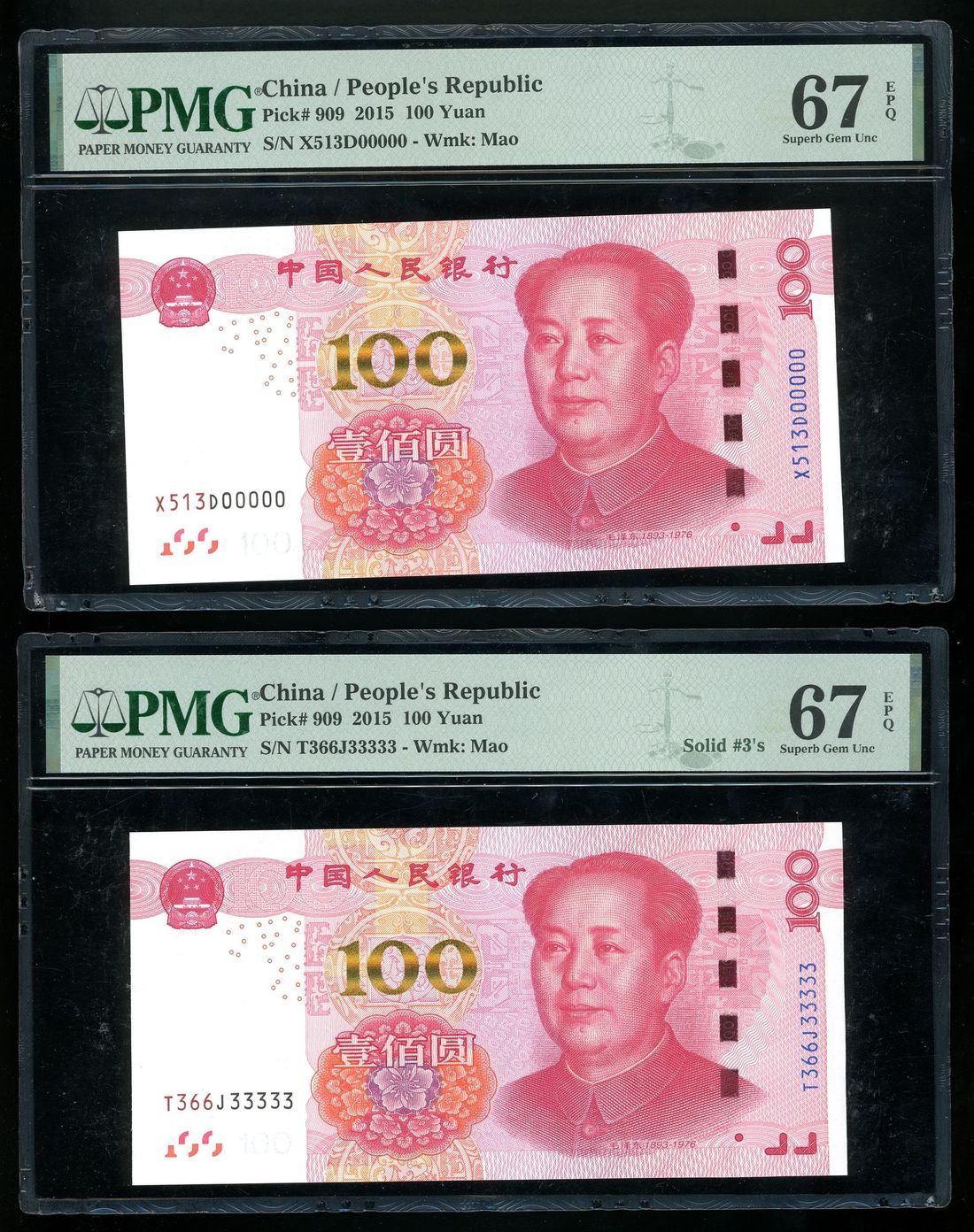 People's Republic of China, a pair of 100 yuan, 2015, serial number X513D00000 and T366J33333, solid #3's, (Pick# 909),