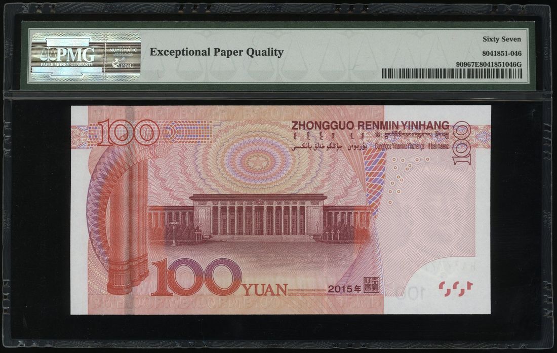 People's Bank of China, 5th Series Renminbi, 2015, 100 yuan, serial number HA77777778, (Pick 909), PMG 67EPQ