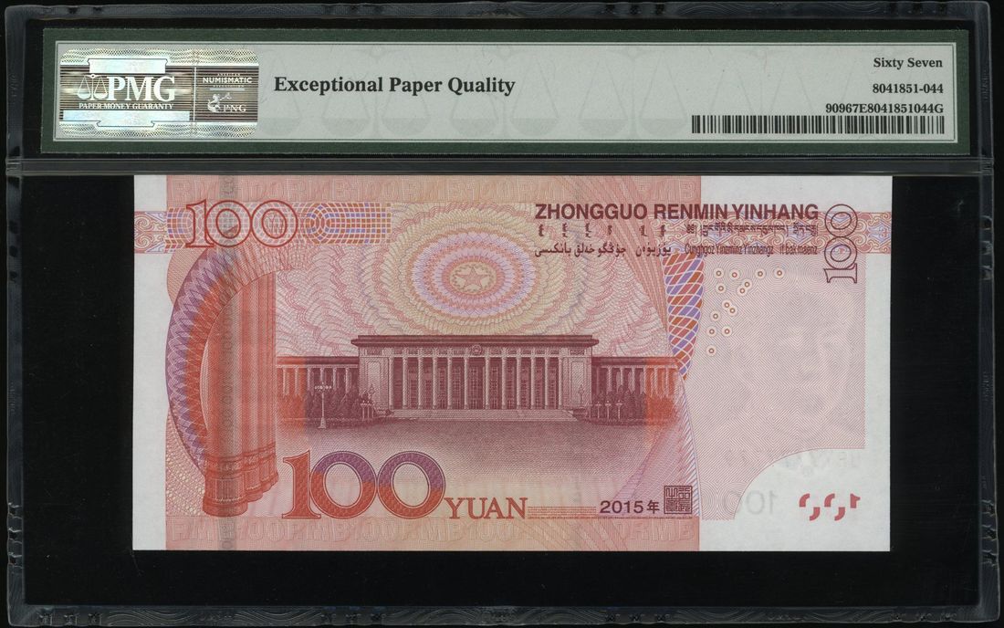 People's Bank of China, 5th Series Renminbi, 2015, 100 yuan, serial number UB77777779, (Pick 909), PMG 67EPQ