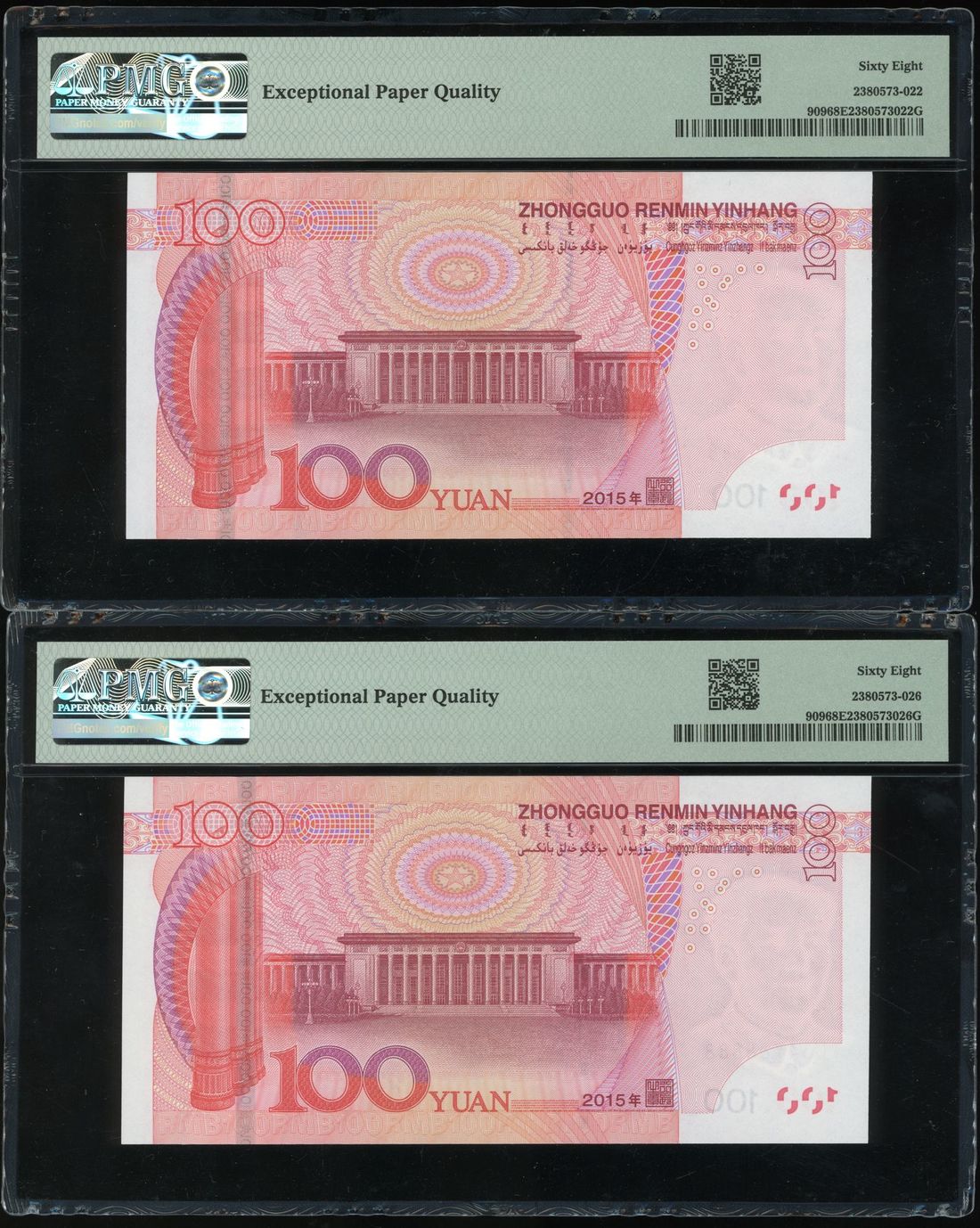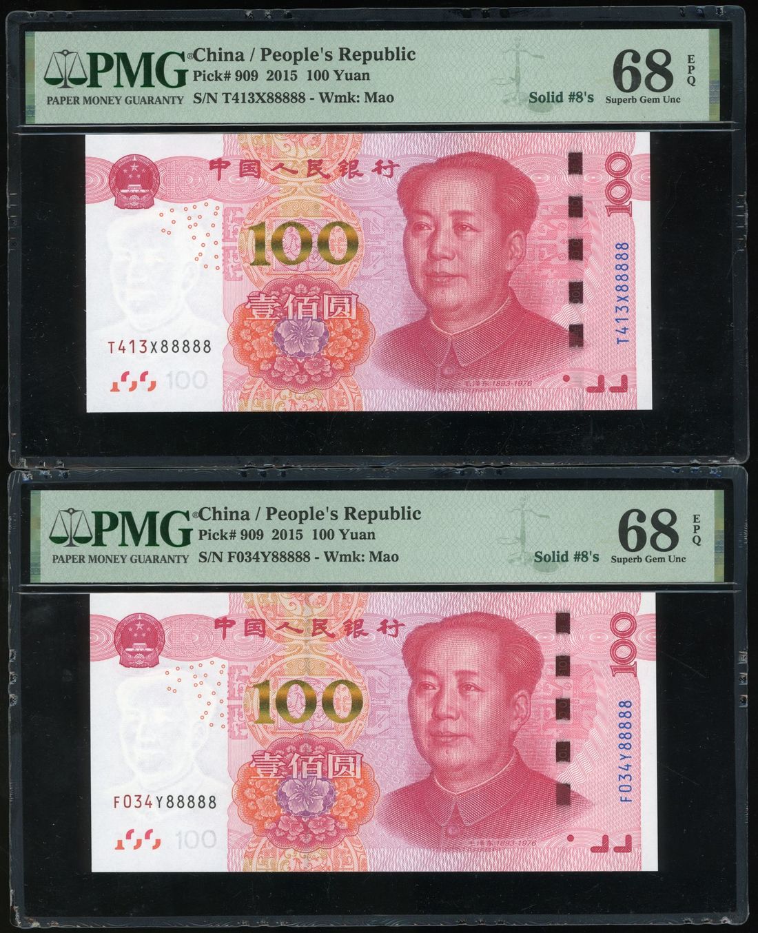 People's Republic of China, a pair of 100 yuan, 2015, serial number T413X88888 and F034Y88888, (Pick# 909),