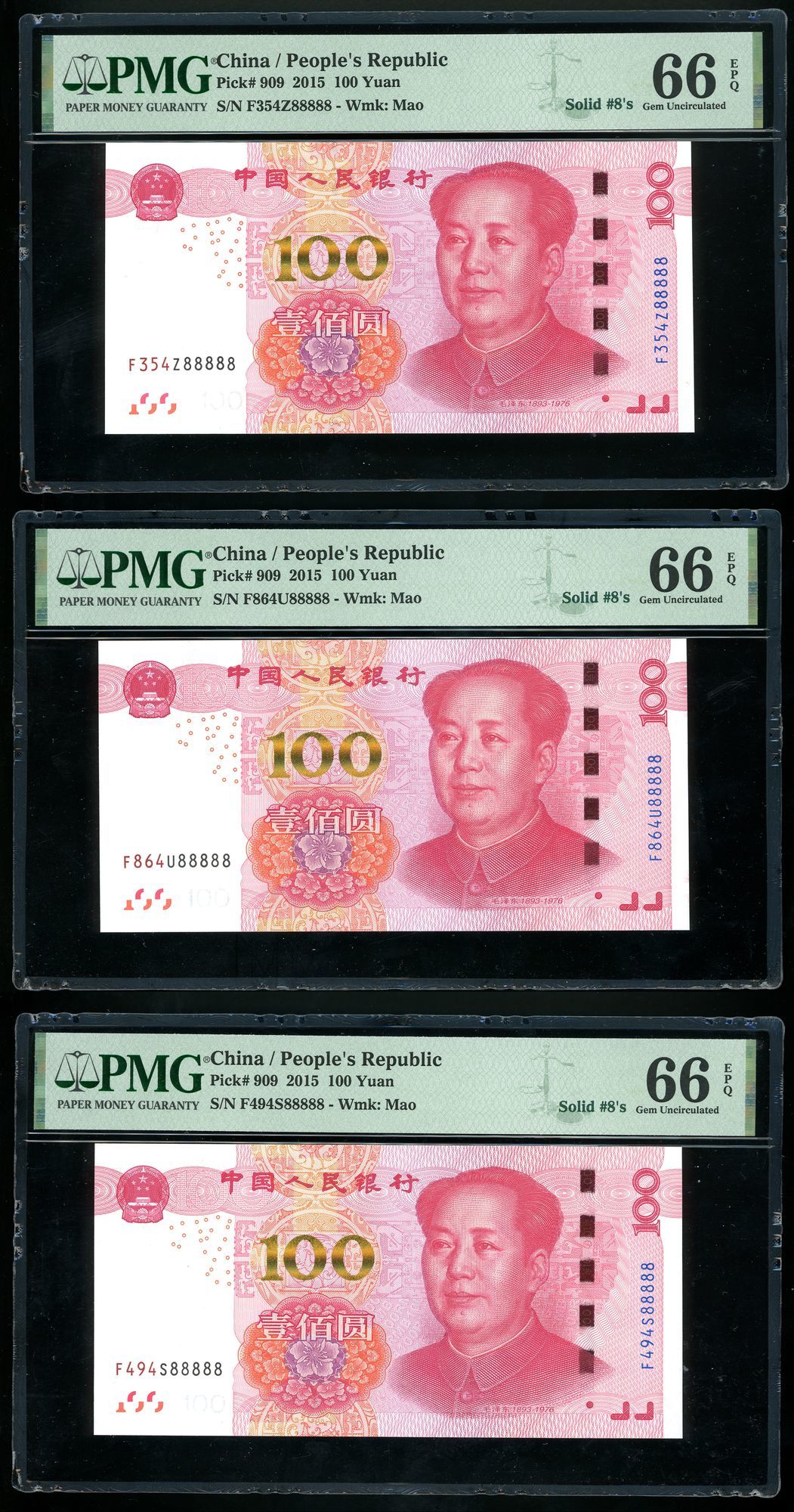 People's Republic of China, a group of 3X 100 yuan, 2015, serial number F354Z88888, F864U88888 and F494S88888 (Pick# 909),