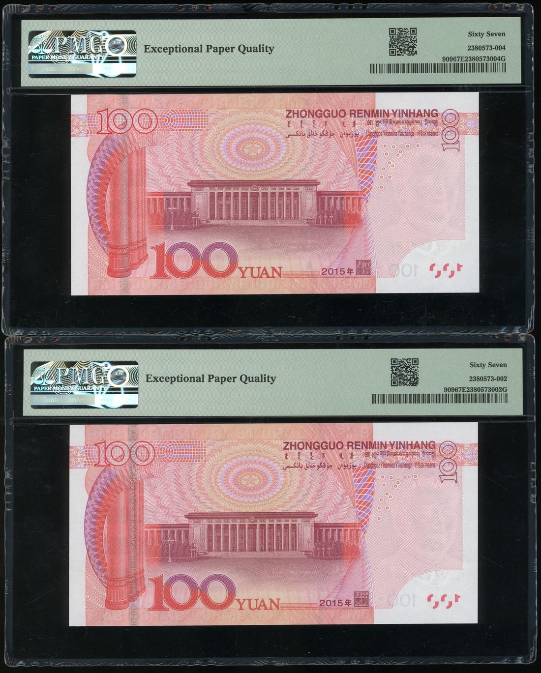 People's Republic of China, a pair of 100 yuan, 2015, serial number T476X88888 and T479X88888, (Pick# 909),