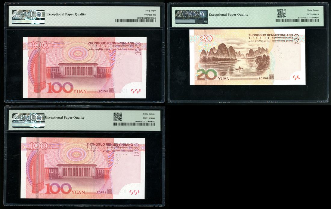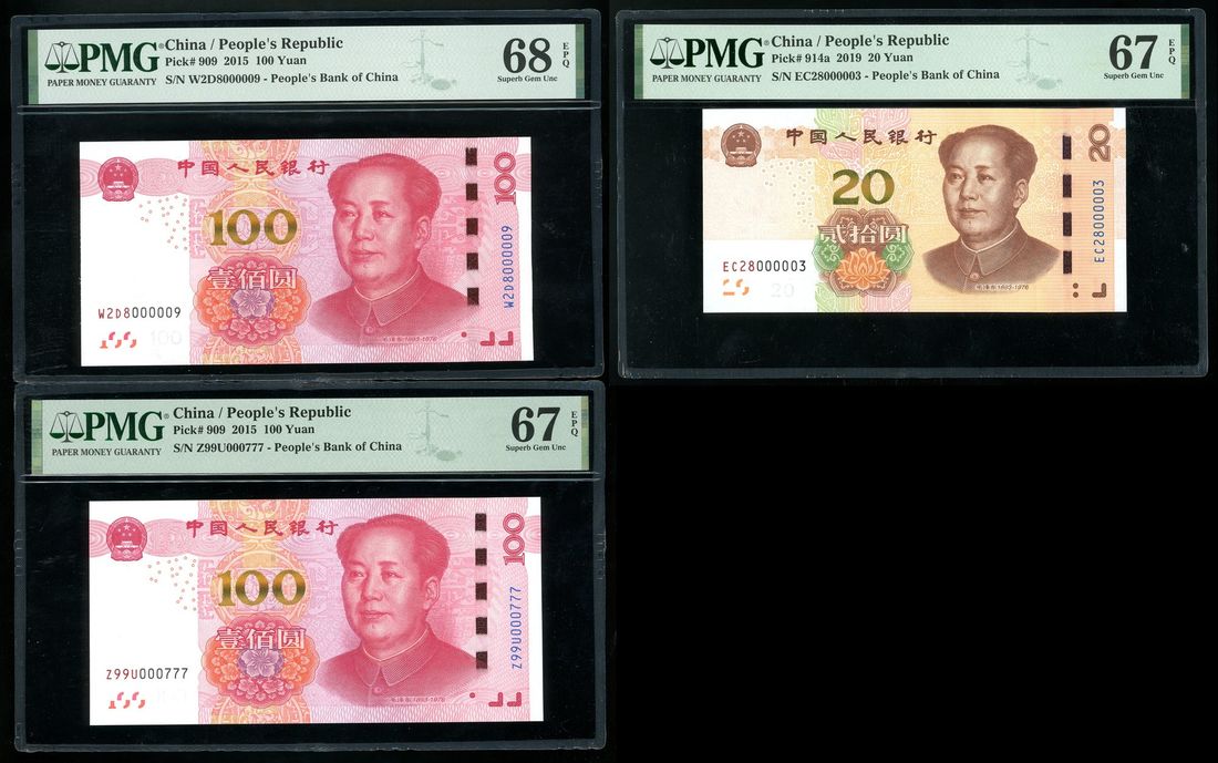 People's Bank of China, 5th Series Renminbi, a group of 3x, including, -100 yuan, 2015, serial number W2D8000009, PMG 68EPQ,