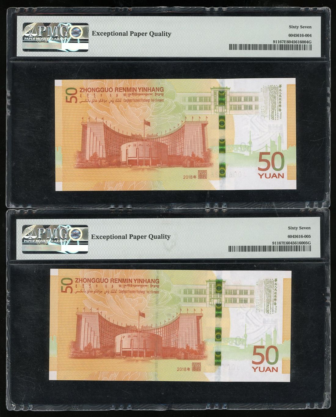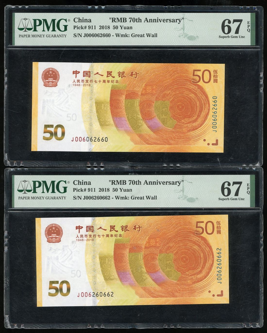 People's Republic of China, a pair of 50 yuan, 2018, 70th Anniversary of RMB commemorative issue, serial numbers J006 062660 and J006 260662,