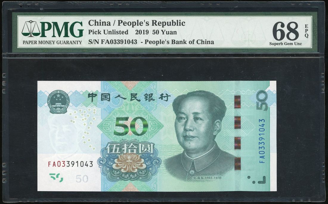 People's Bank of China, 5th Series Renminbi, 50 yuan, 2019, serial number FA03391043, PMG 68EPQ