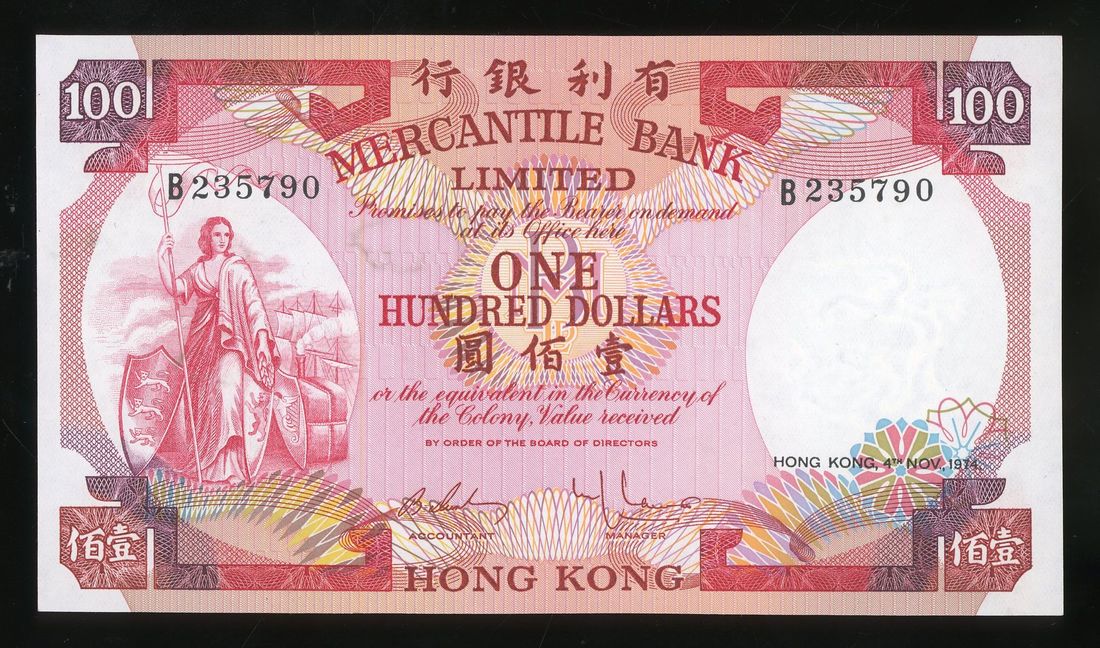 Mercantile Bank, Hong Kong, $100, 4.11.1974, serial number B 235790, (Pick 245), Extremely Fine
