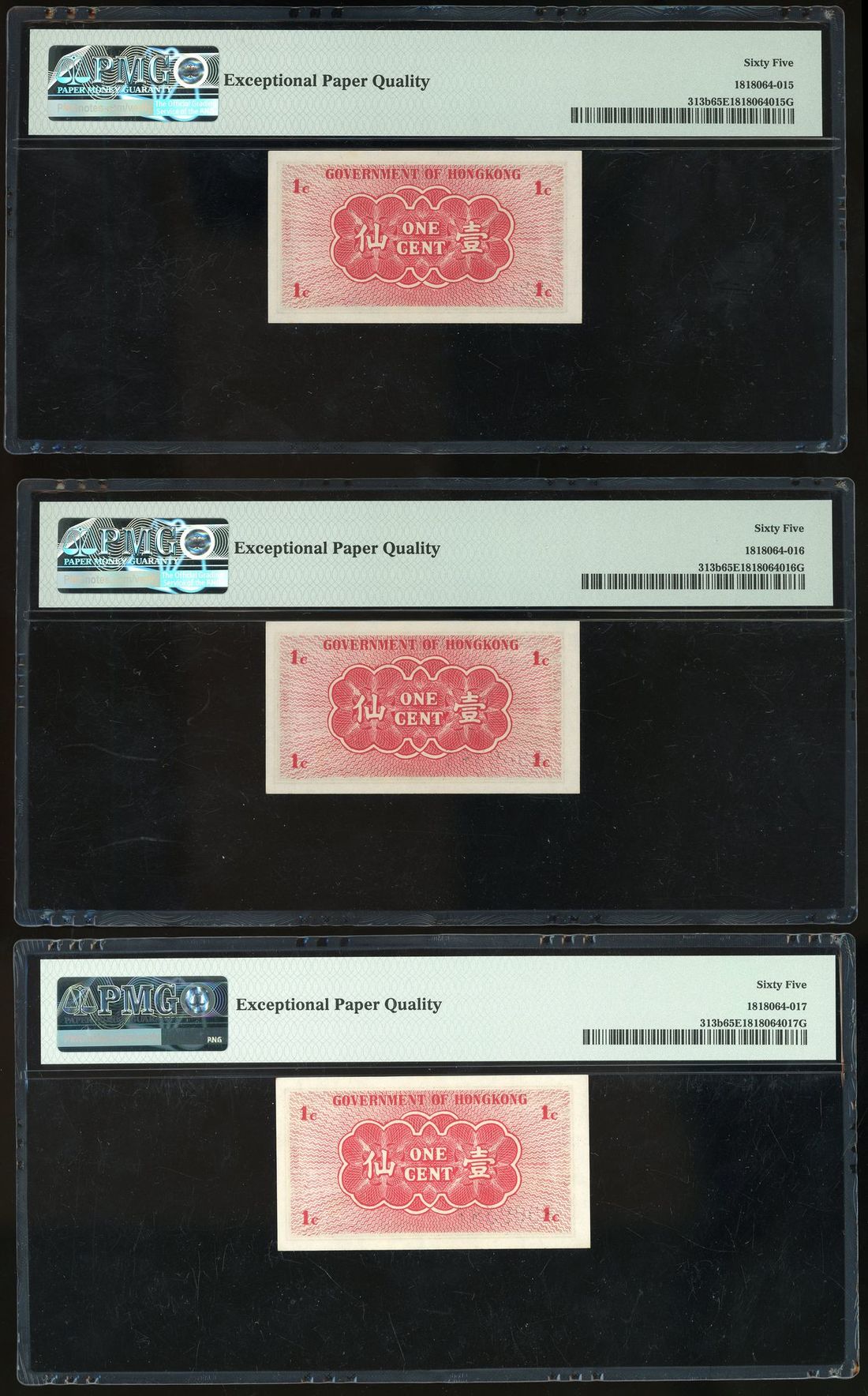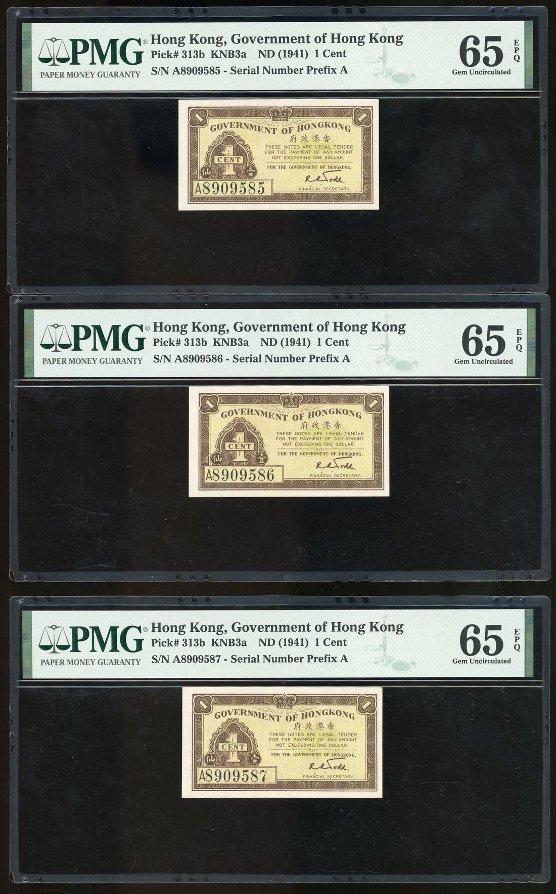 Government of HongKong, consecutive 1 cent (3), ND (1941), serial numbers A 8909585/6/7, (Pick 313b), all PMG 65EPQ (3)