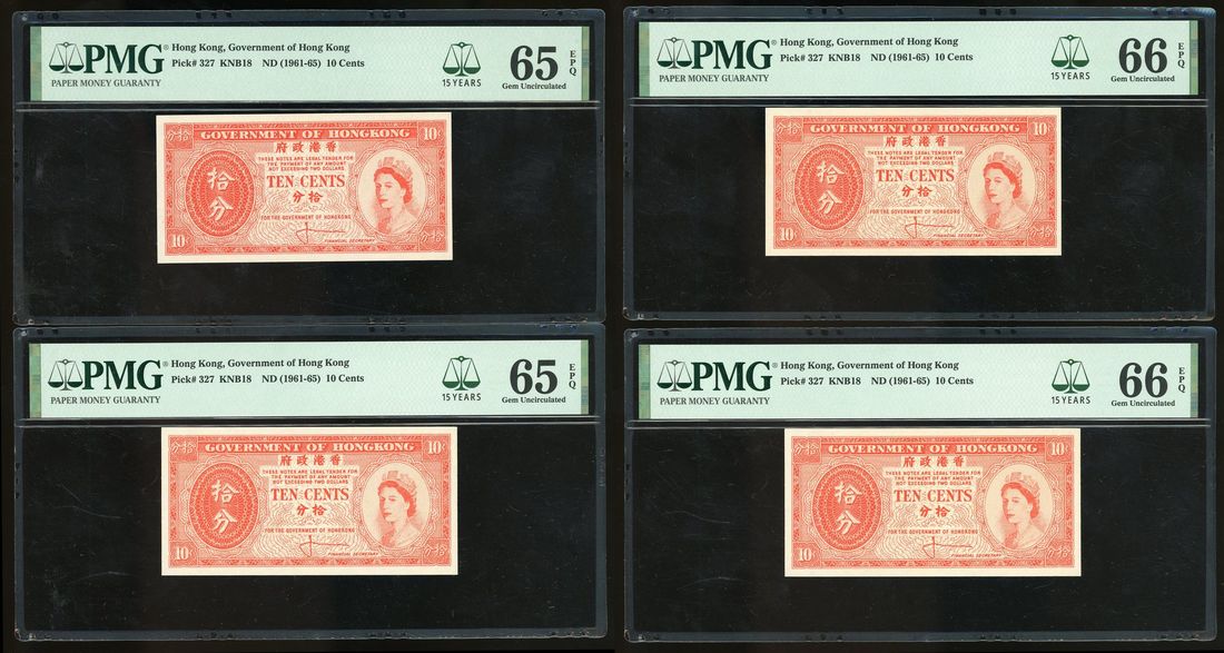 Government of HongKong, 10 cents (4), ND (1961-65), no serial number, (Pick 327), PMG 65-66EPQ (4)
