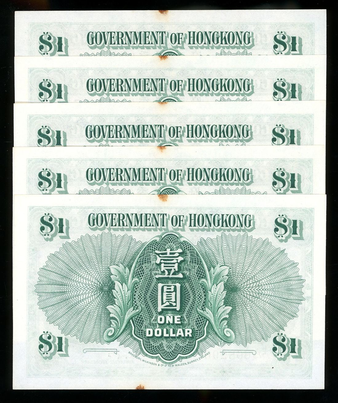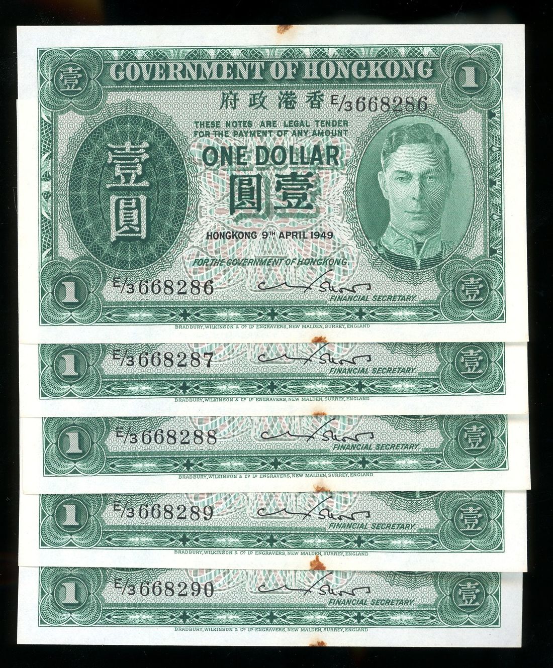 Government of HongKong, consecutive $1 (5), 9.4.1949, serial numbers E/3 668286/87/88/89/90, (Pick 324a), rust spot at top and lower margin, otherwise original paper, about uncirculated (5)