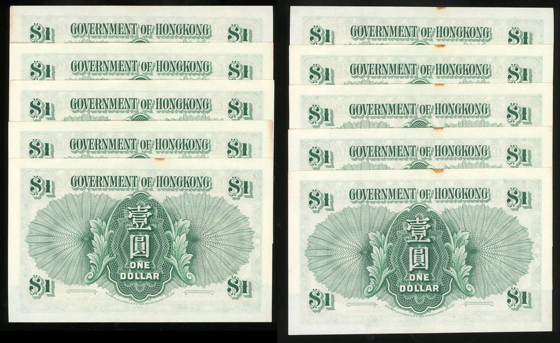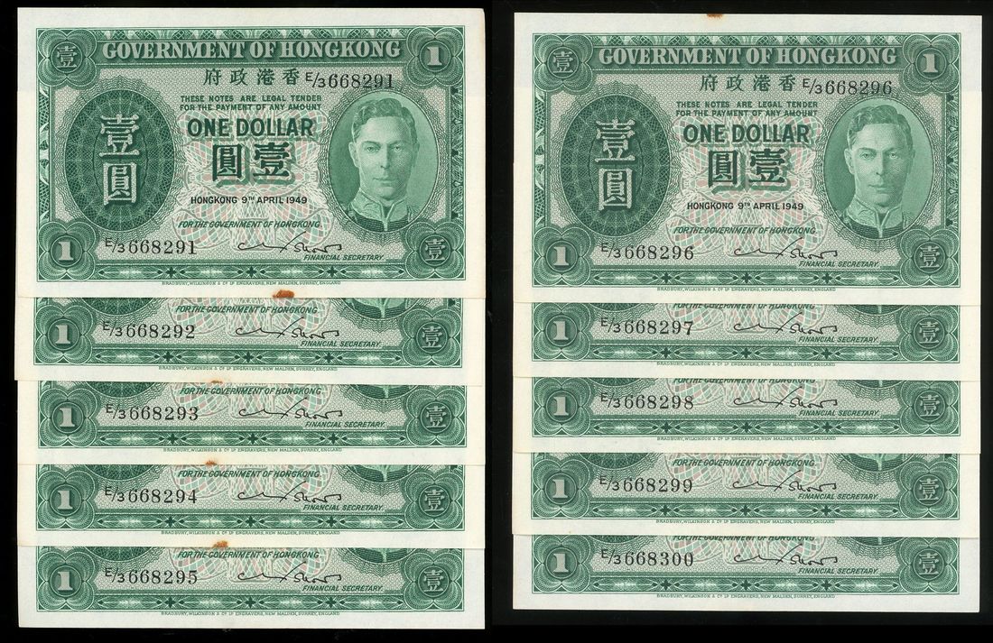 Government of HongKong, consecutive $1 (10), 9.4.1949, serial numbers E/3 668291-300, (Pick 324a), all notes with either rust spot at top or lower margin, some with light foxing at edge. Otherwise about uncirculated (10)