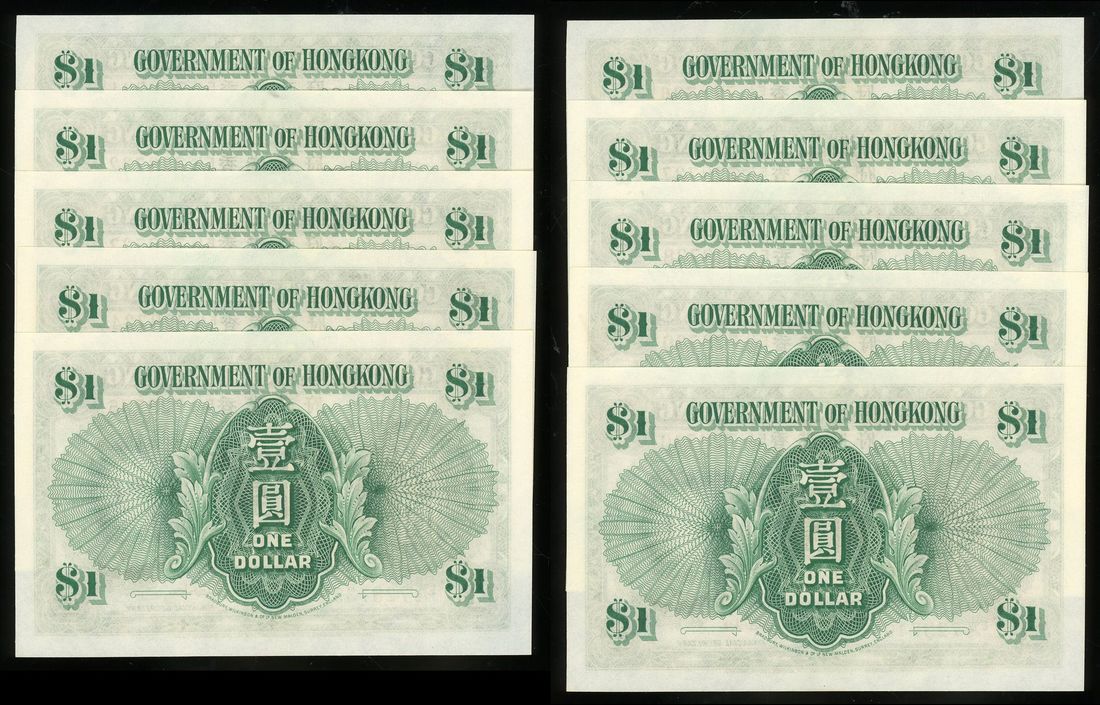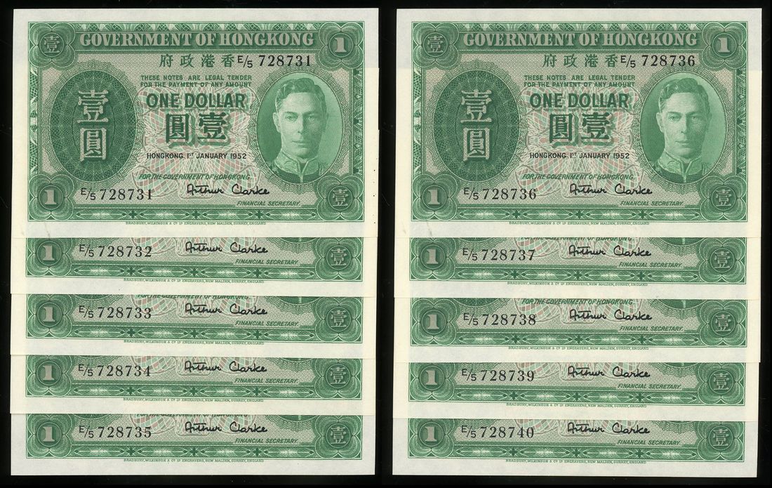 Government of HongKong, consecutive $1 (10), 1.1.1952, serial numbers E/5 728731-40, (Pick 324b), all with light fold at centre, about uncirculated (13)
