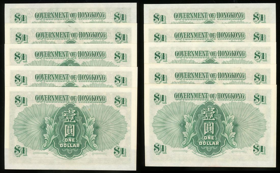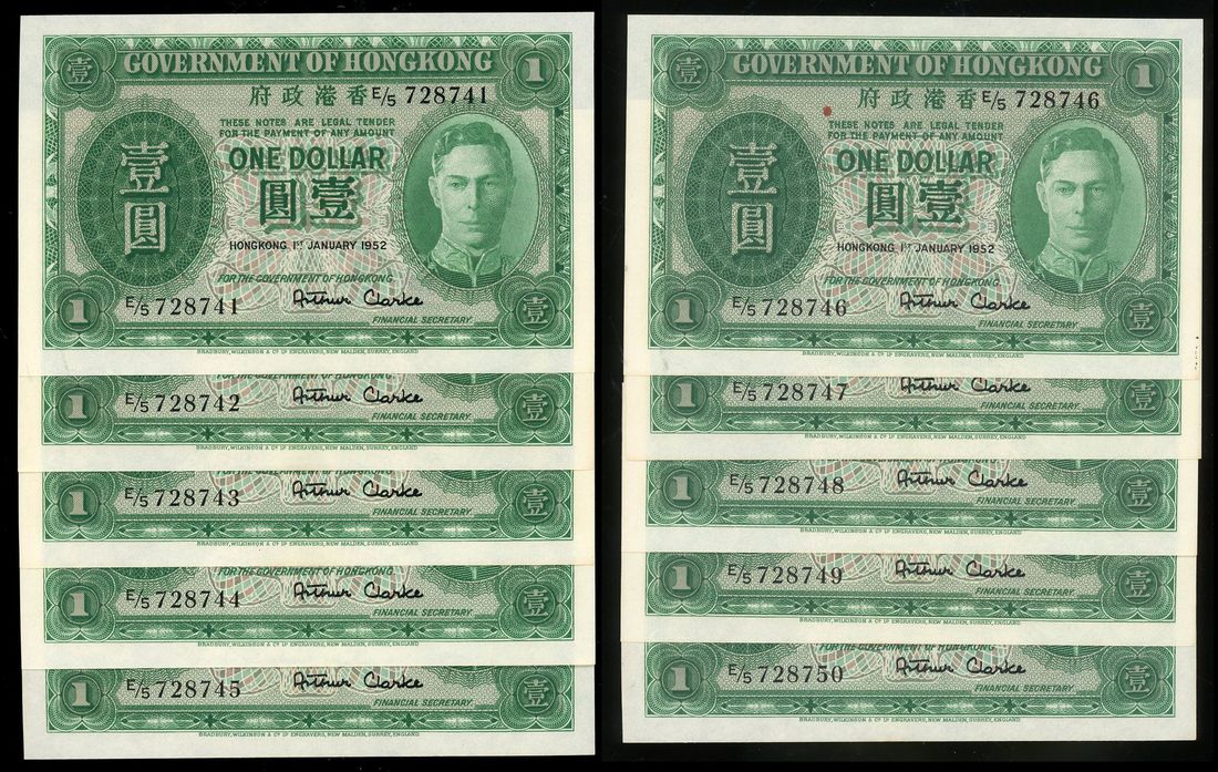 Government of HongKong, consecutive $1 (10), 1.1.1952, serial numbers E/5 728741-50, (Pick 324b), all with light fold at centre, some with light foxing at edge, about uncirculated (13)
