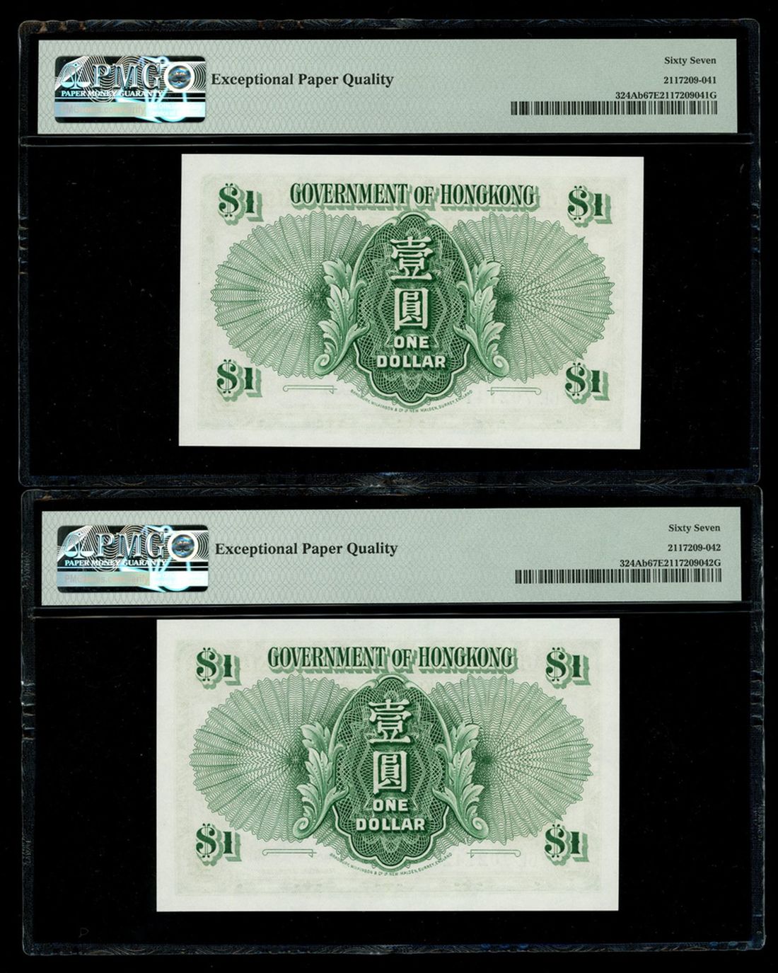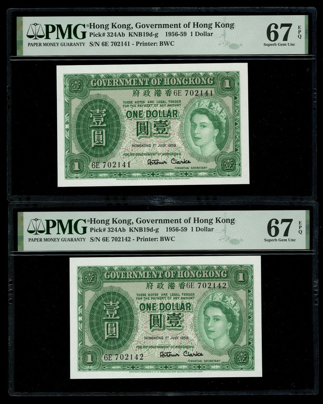 Government of Hongkong, a consecutive pair of $1, 1.7.1959, serial numbers 6E 702141-42, (Pick 324Ab), both graded PMG 67EPQ Superb Gem Uncirculated (2)