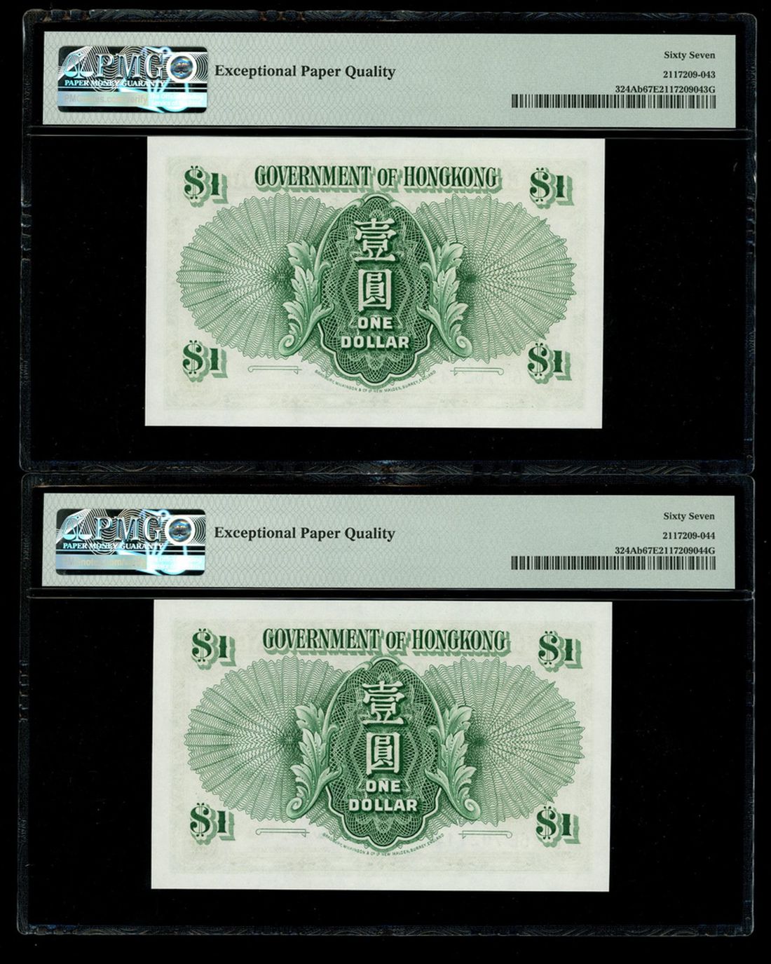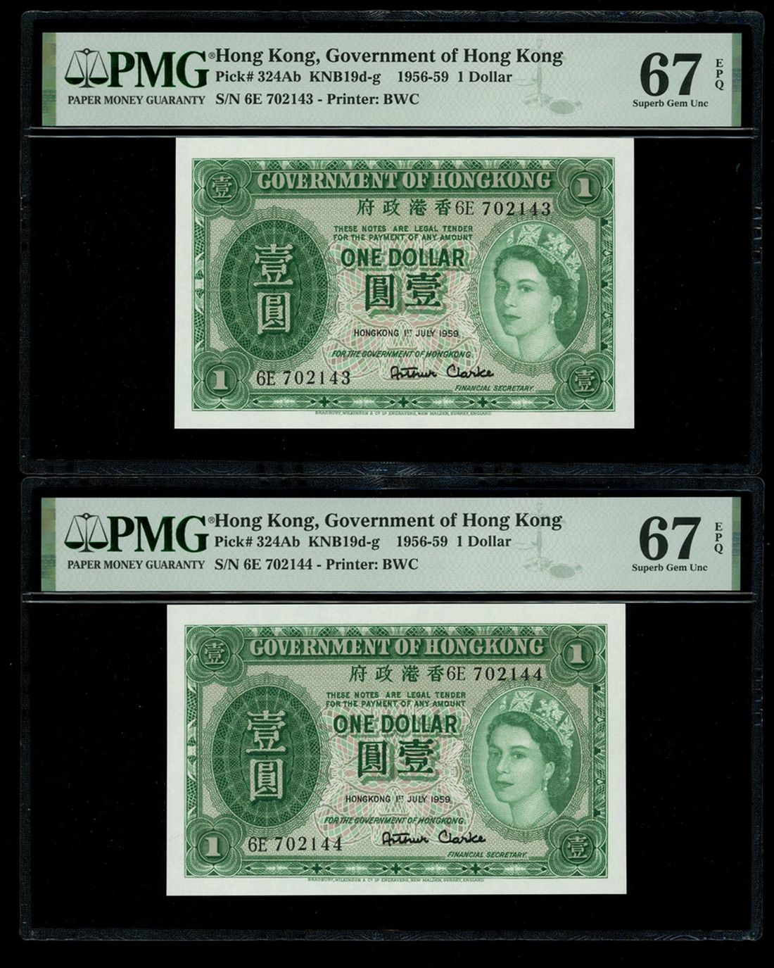 Government of Hongkong, a consecutive pair of $1, 1.7.1959, serial numbers 6E 702143-44, (Pick 324Ab), both graded PMG 67EPQ Superb Gem Uncirculated (2)