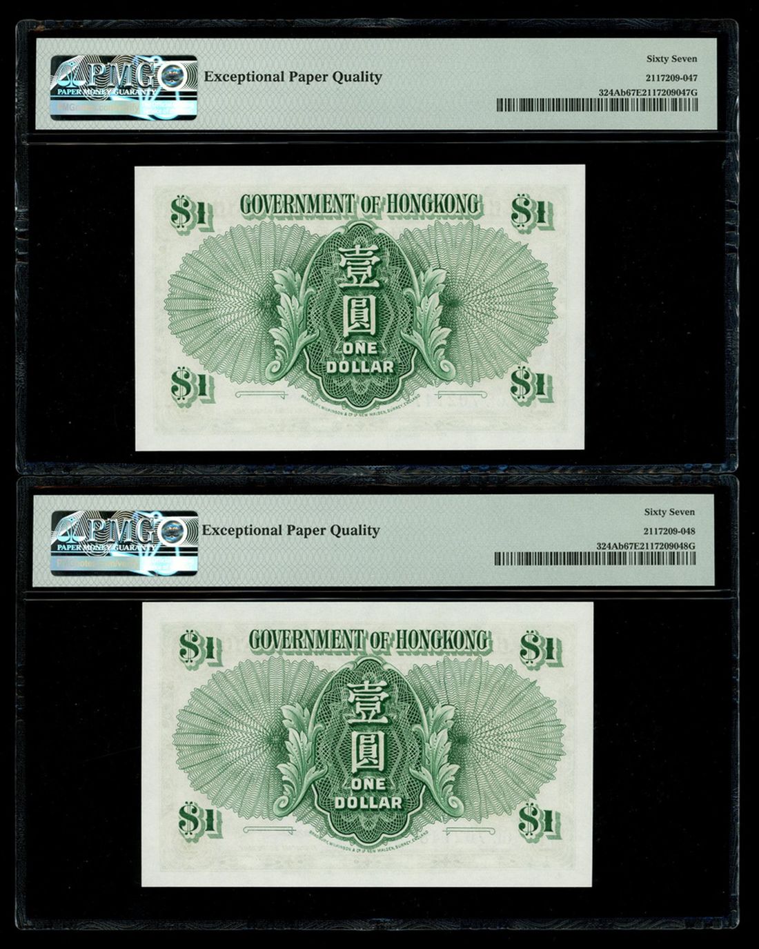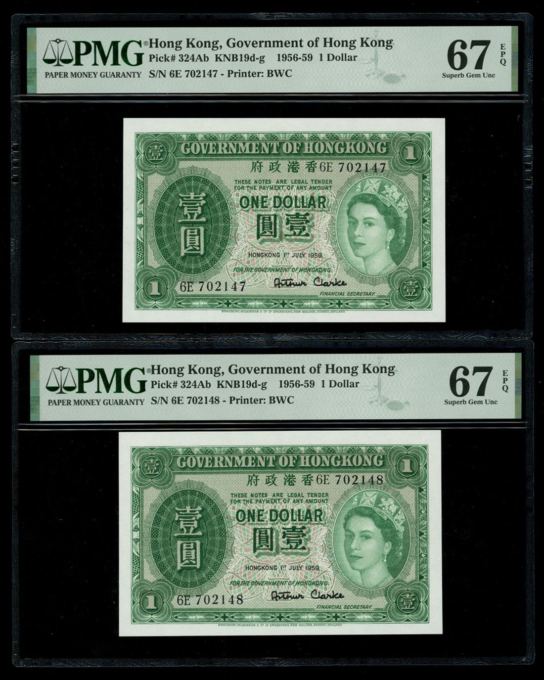 Government of Hongkong, a consecutive pair of $1, 1.7.1959, serial numbers 6E 702147-48, (Pick 324Ab), both graded PMG 67EPQ Superb Gem Uncirculated (2)
