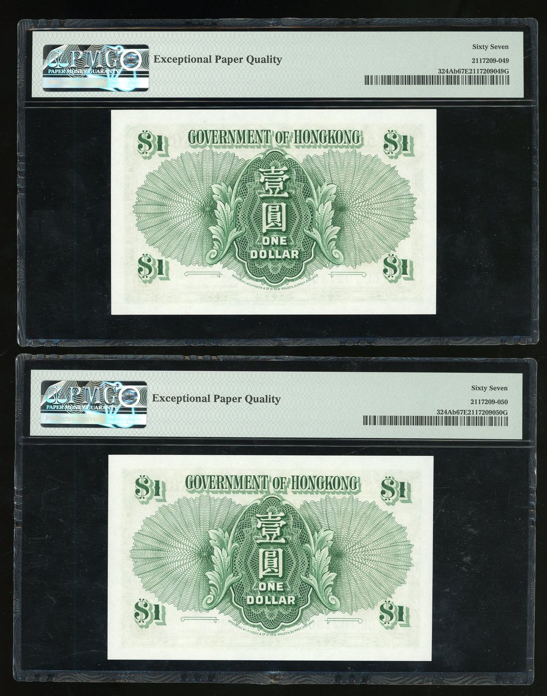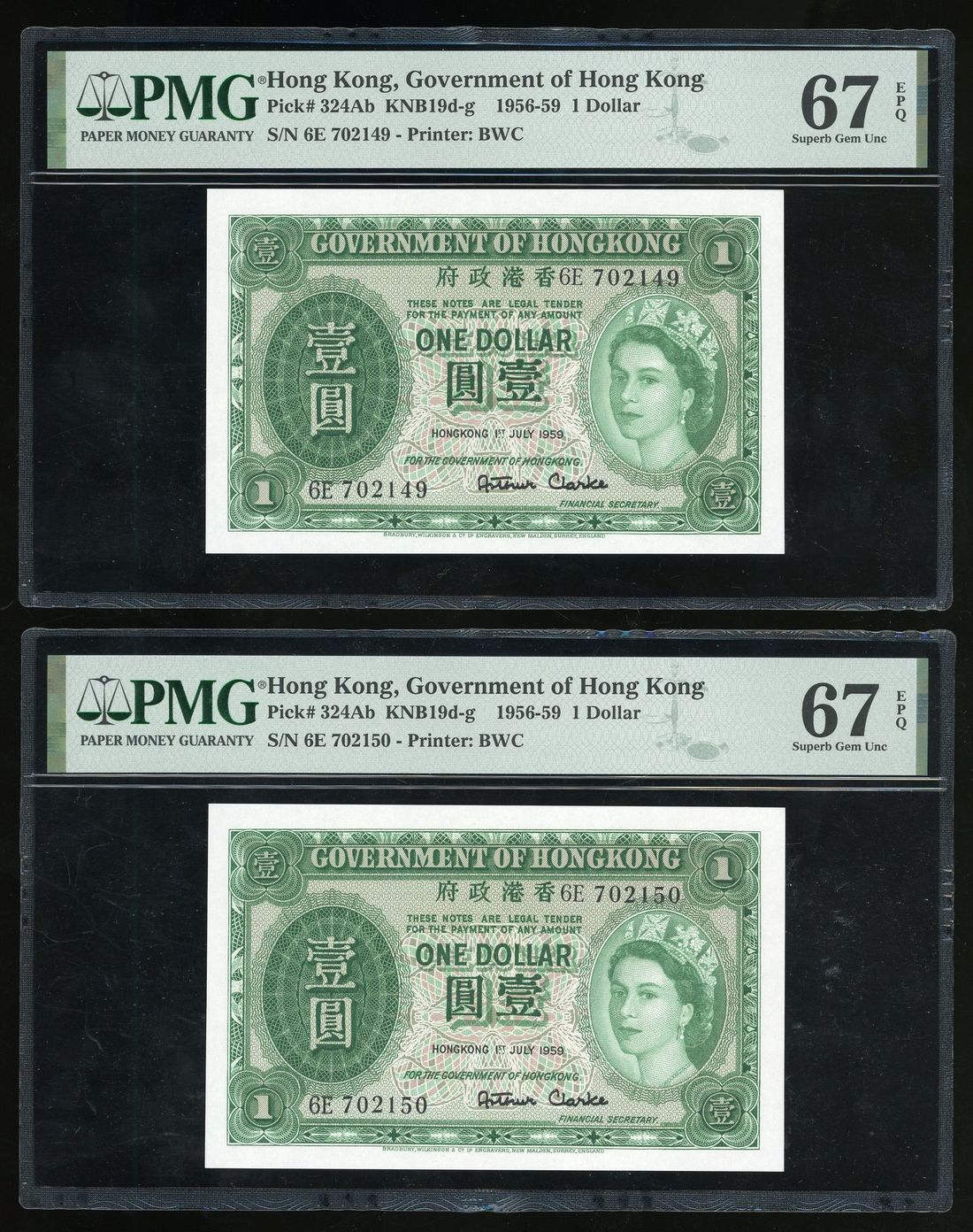 Government of Hongkong, a consecutive pair of $1, 1.7.1959, serial numbers 6E 702149-50, (Pick 324Ab), both graded PMG 67EPQ Superb Gem Uncirculated (2)