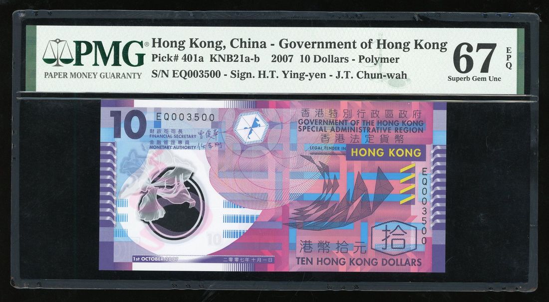 Government of Hong Kong, $10, 1.10.2007, serial number EQ 003500, (Pick 401a), PMG 67EPQ Superb Gem Uncirculated