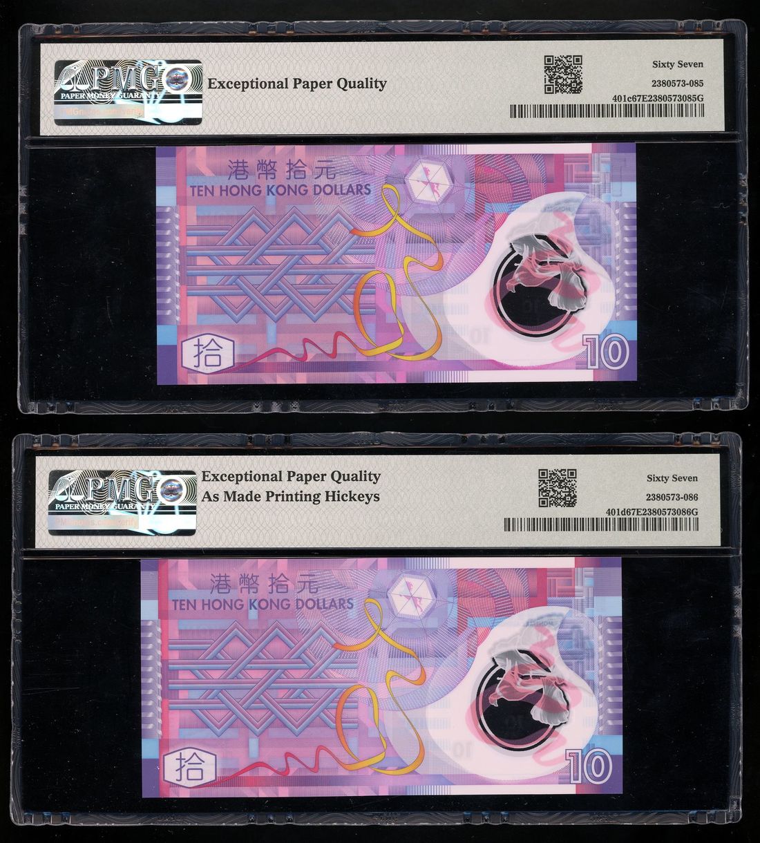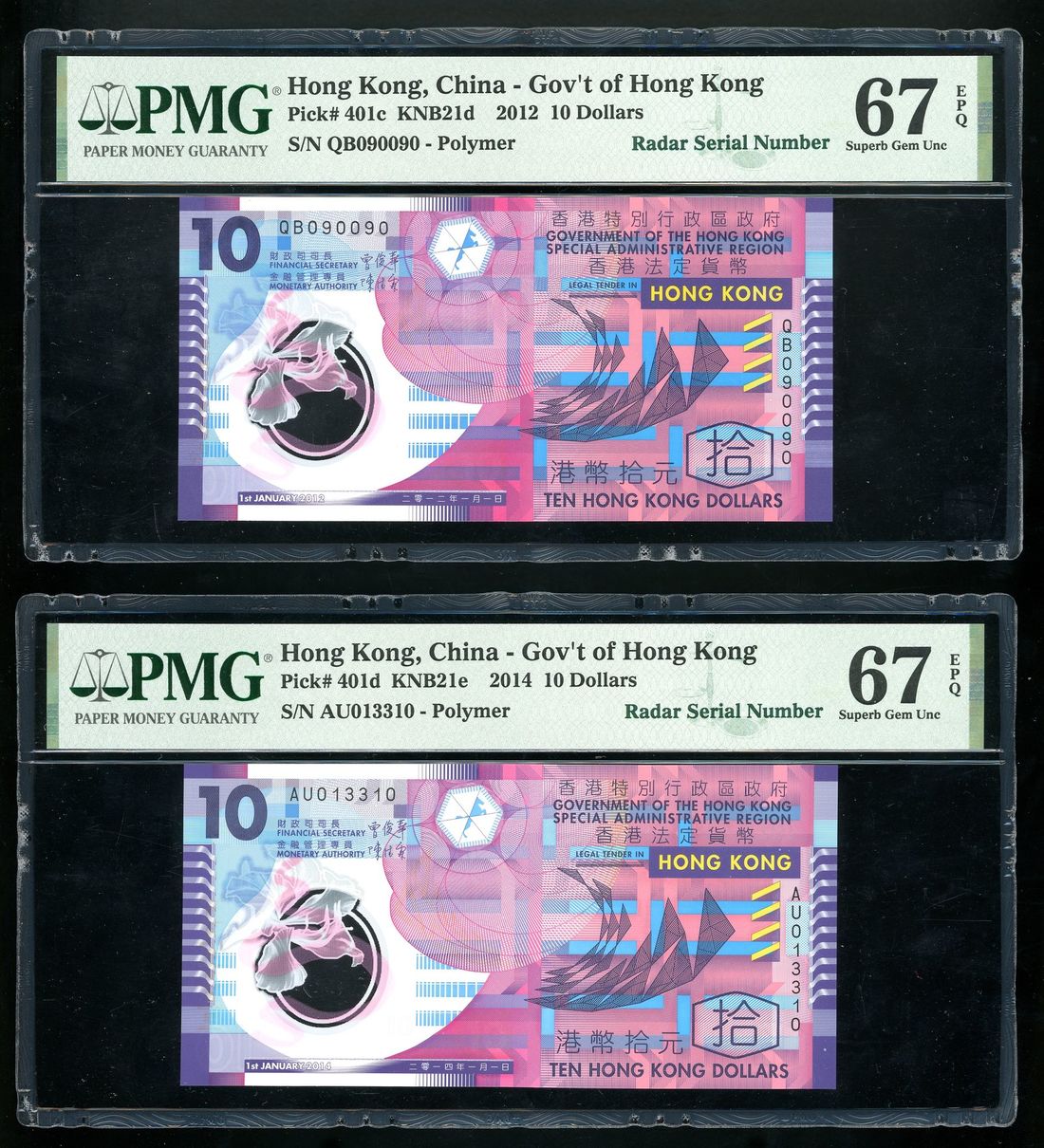 Government of Hong Kong, a pair of $10, 2012 and 2014, radar serial number QB0900909 and AU013310, (Pick# 401c, 401d),