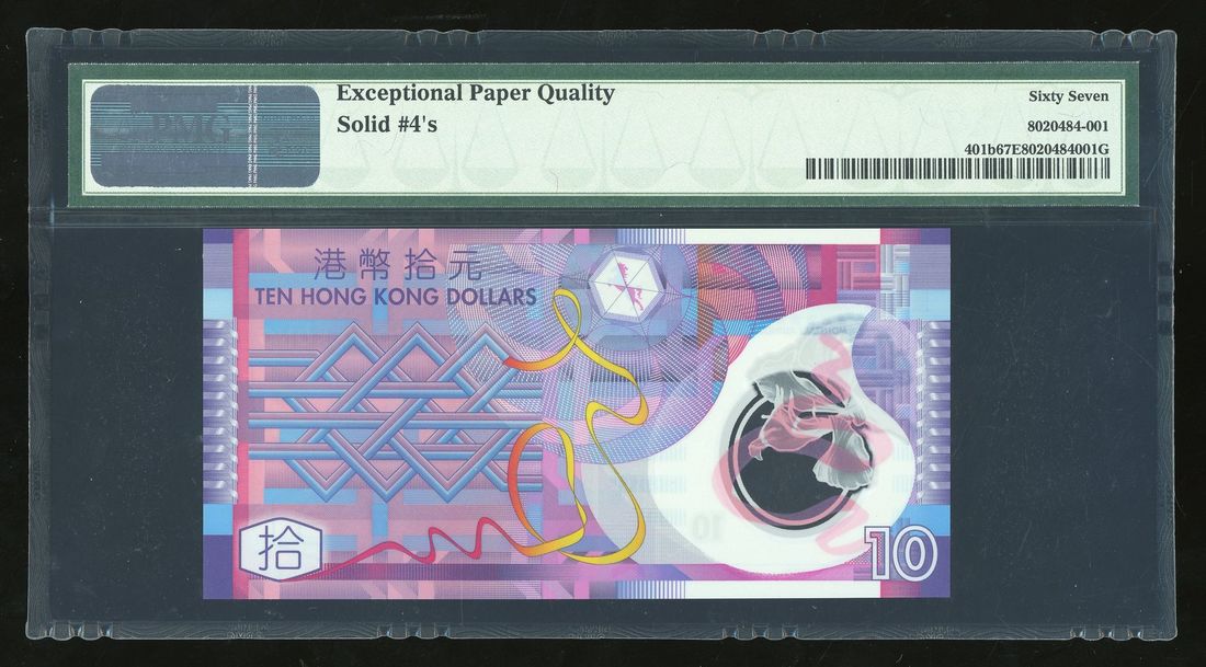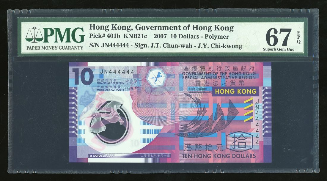 Government of HongKong, $10, 1.10.2007, polymer, solid serial number JN 444444, (Pick 401a), PMG 67EPQ