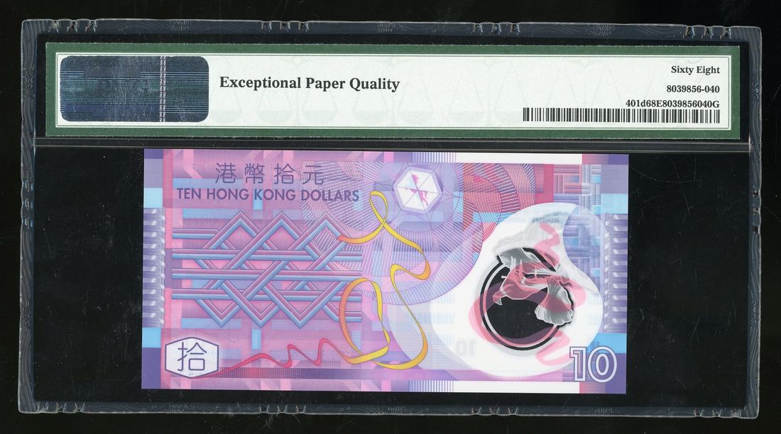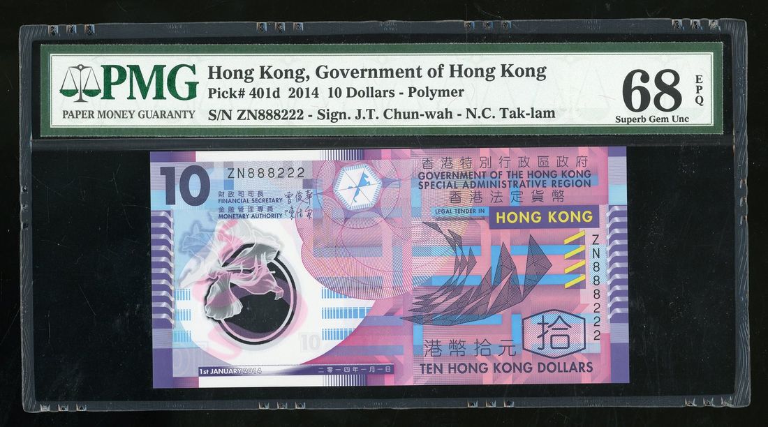 Government of HongKong, polymer $10, 2014, fancy serial number ZN888222, (Pick 401d), PMG 68EPQ