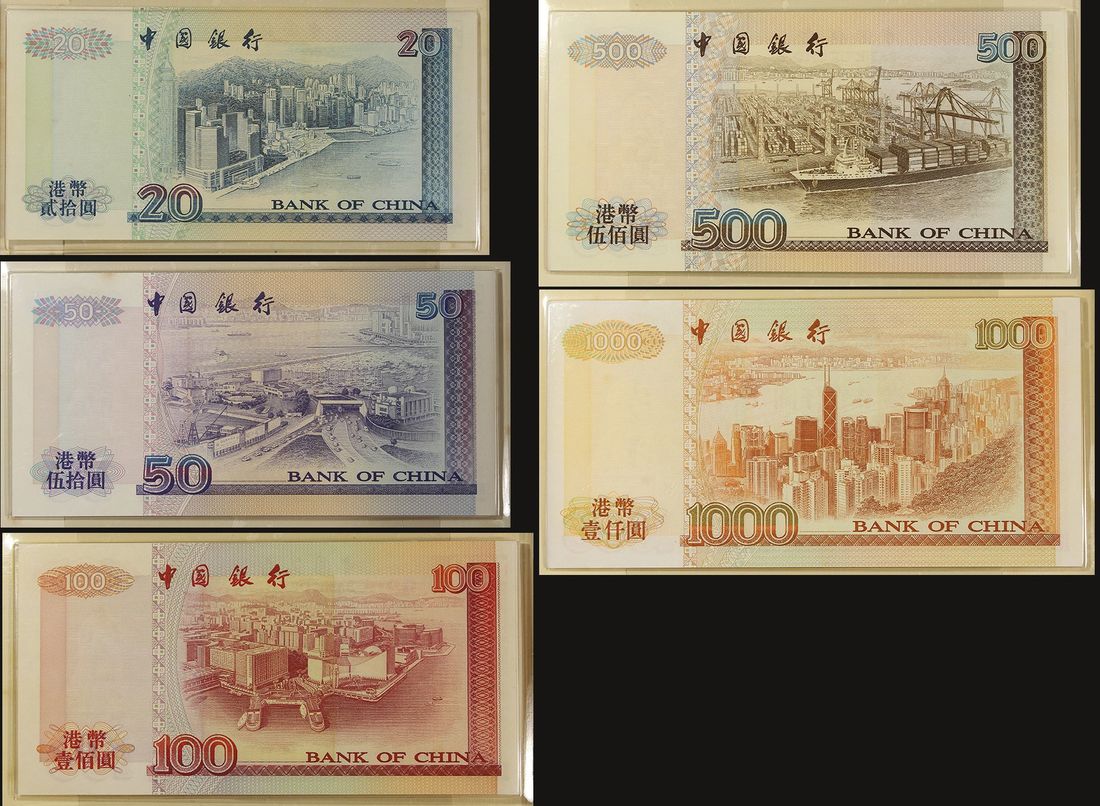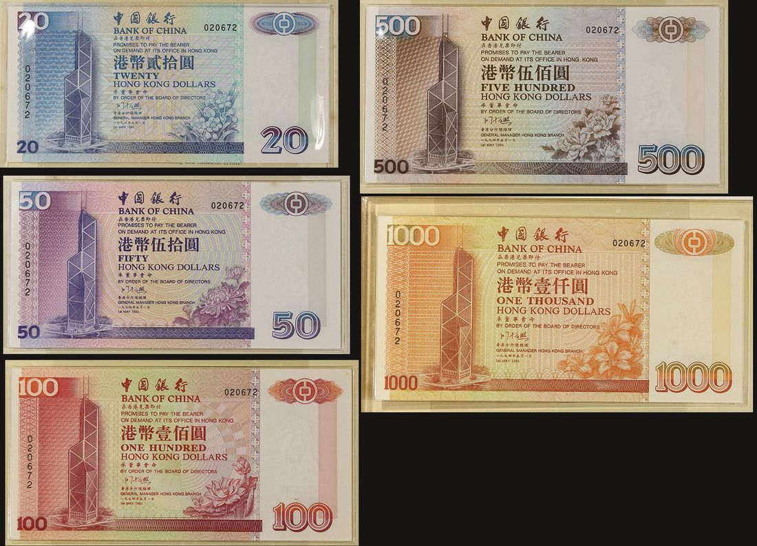 Bank of China, Hong Kong, a set of 1994 issues with matching serial number 020672, including $20, 50, 100, 500 and 1000,