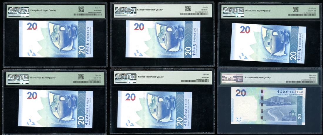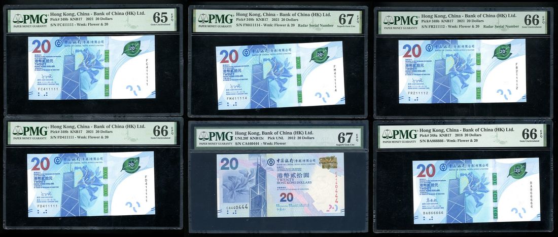 Bank of China, Hong Kong, a group of 5x $20 with fancy serial numbers, 2012-2021, including near solid serial numbers CA 440444, BA 866666, FC 411111, FD 411111, radar serial numbers FM 411114 and FR 211112,