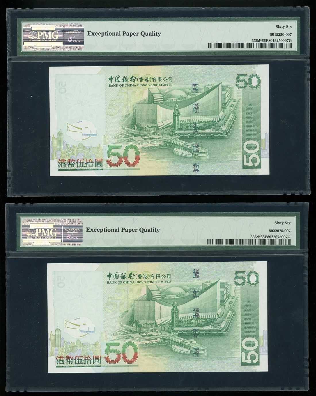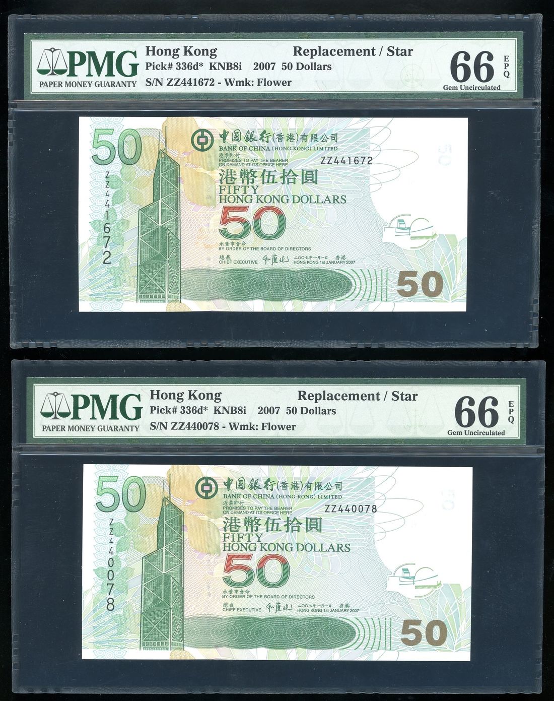 Bank of China, Hong Kong, a pair of replacement $50, 1.1.2007, serial numbers ZZ 440078 and ZZ441672,