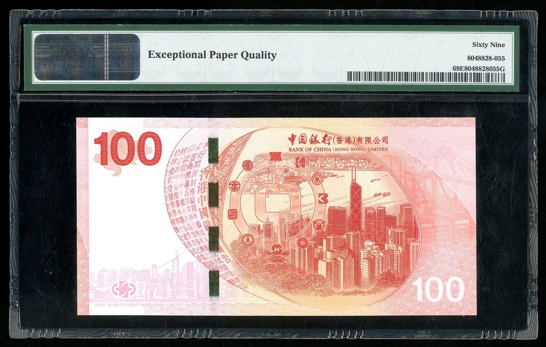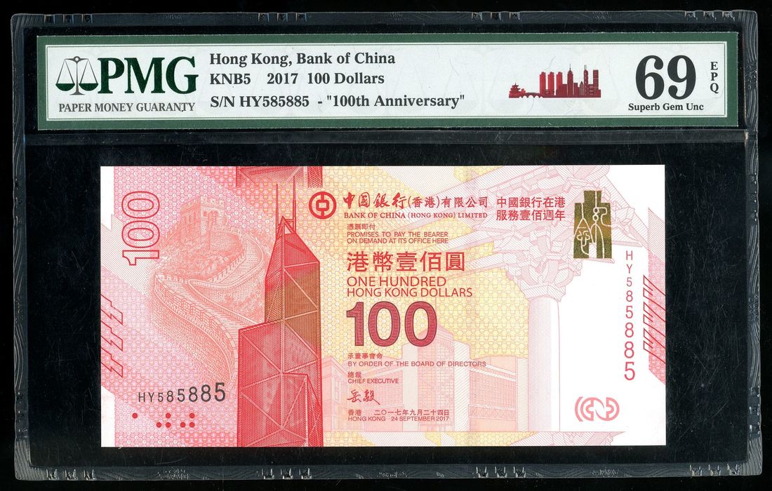 Bank of China, Hong Kong, $100, 24.9.2017, serial number HY585885, PMG 69EPQ.