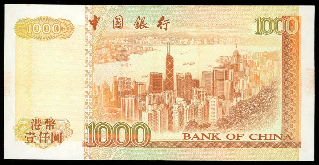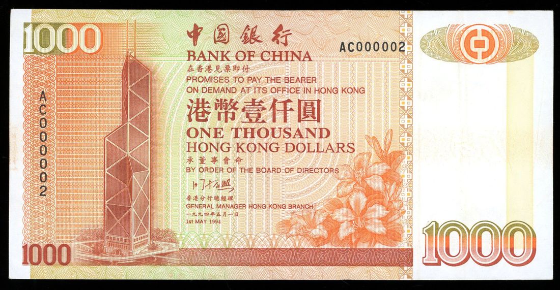 Bank of China, Hong Kong, $1000, 1.5.1994, low serial number AC000002, (Pick 333a), minor foxing at margin, very fine. Very low number of the 1994 last prefix