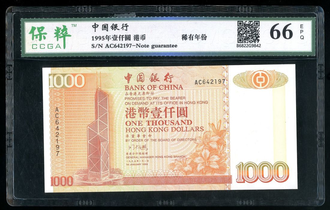 Bank of China, Hong Kong, $1000, 1.1.1995, serial number AC642197, key date, (Pick 333b),