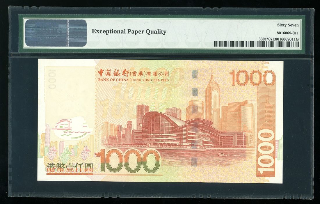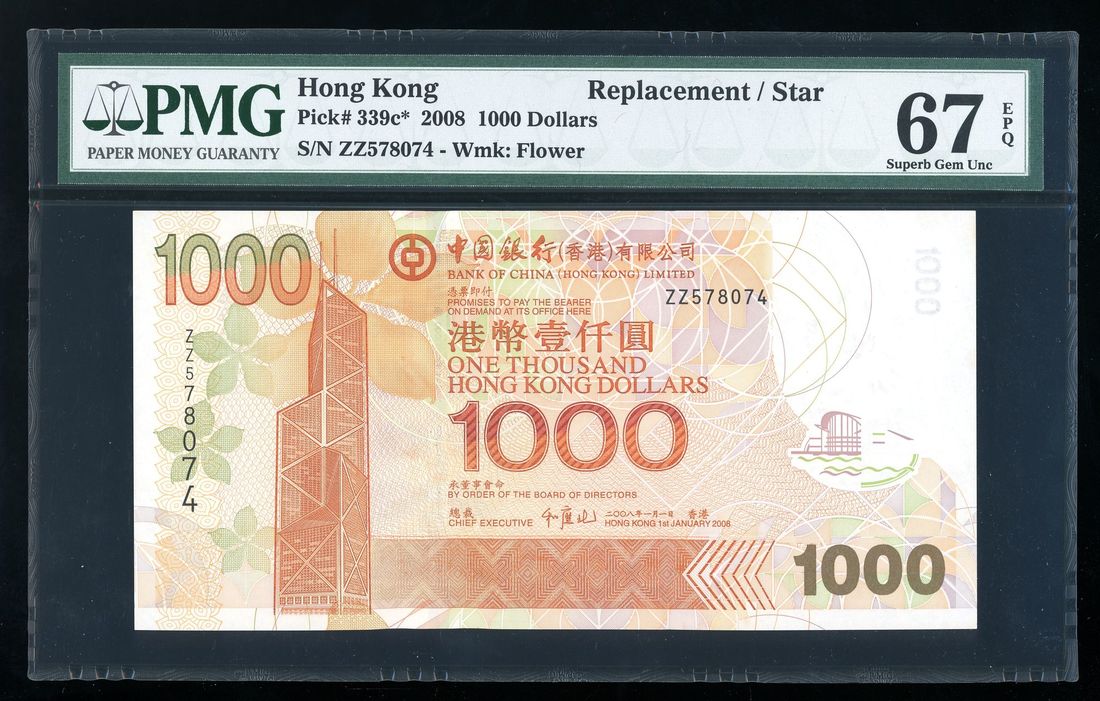 Bank of China, Hong Kong, replacement $1000, 1.1.2008, serial number ZZ 578074, (Pick 339c*), PMG 67EPQ