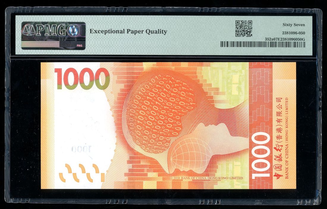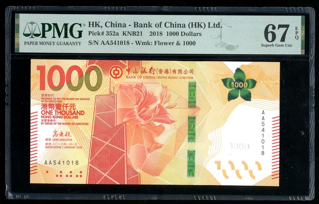 Bank of China, Hong Kong, $1000, 1.1.2018, serial number AA 541018, (Pick 352a), PMG 67EPQ, first prefix