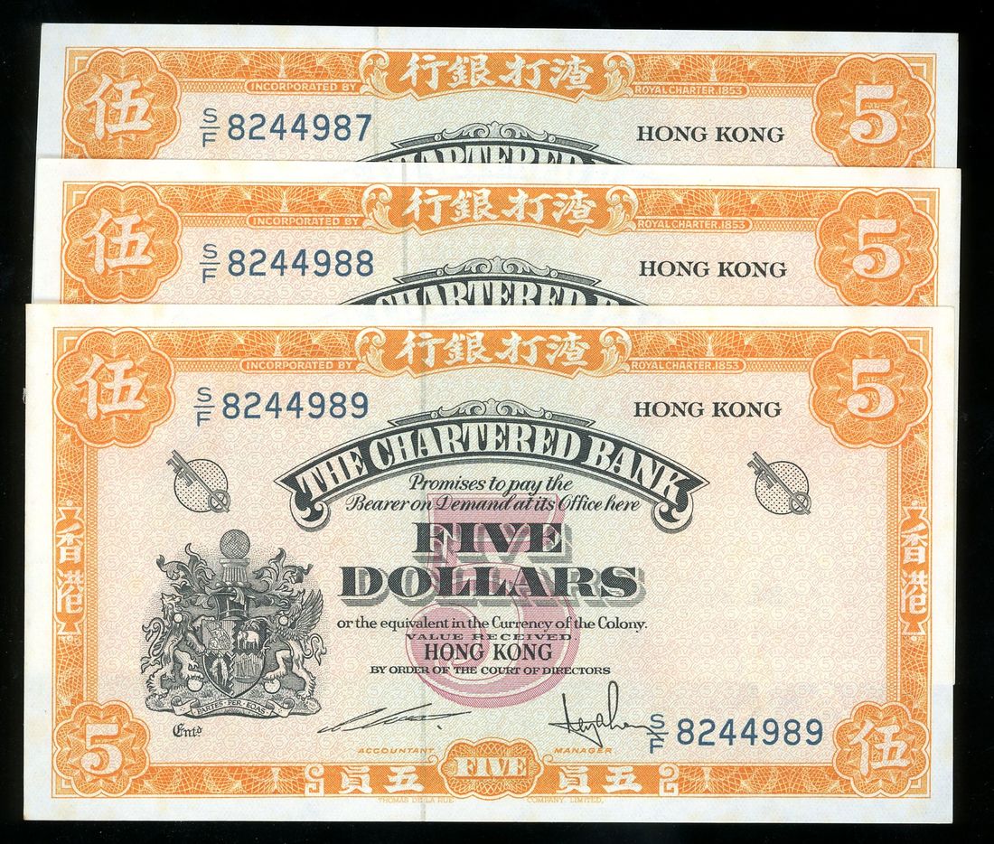 Chartered Bank, Hong Kong, a consecutive trio of $5, ND (1967), serial numbers S/F 8244987-89, (Pick 69), About Uncirculated, some foxing at the margins (3)