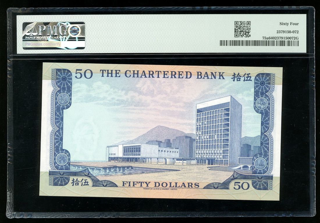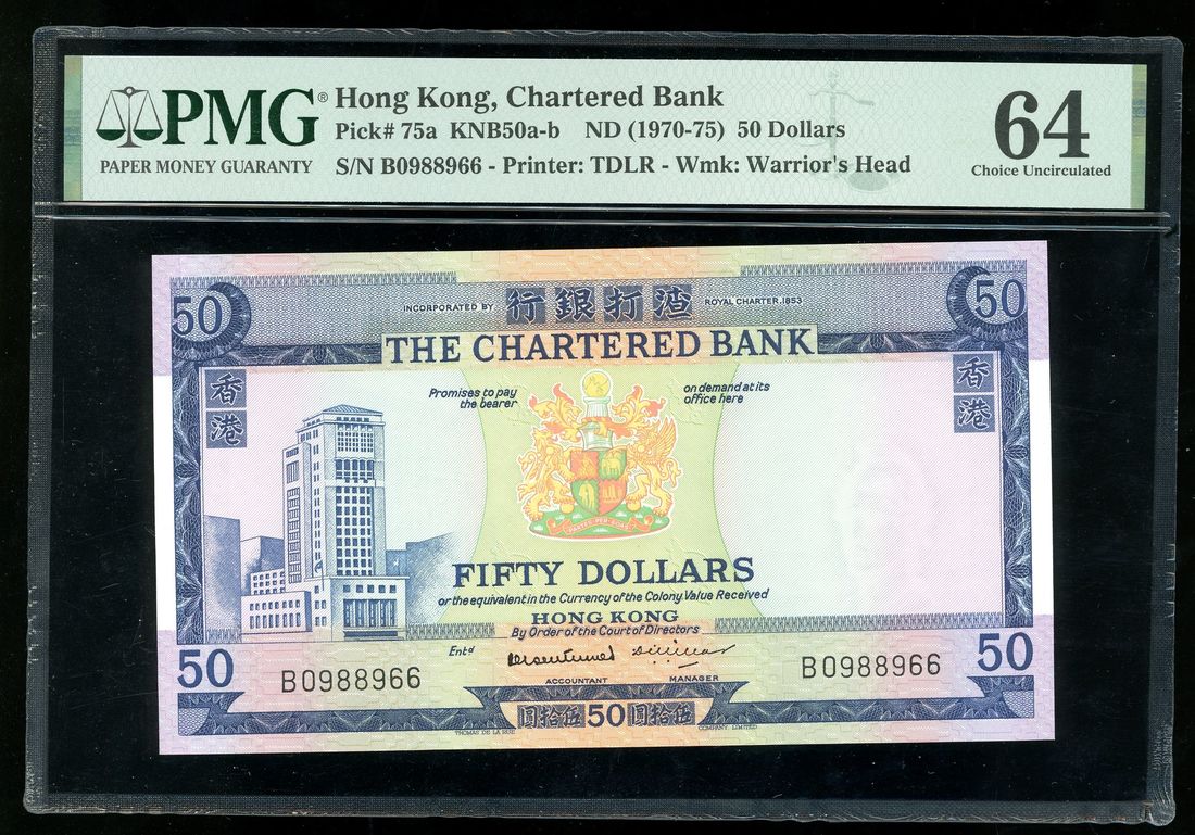 Chartered Bank, Hong Kong, $50, ND (1970-75), serial number B0988966, (Pick 75a), PMG 64. Nice serial number which are also numbers while upside down. The always soughtafter 'Blue House' note