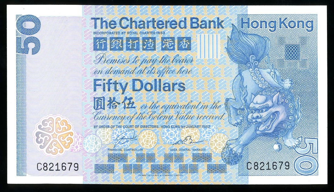 Chartered Bank, Hong Kong, $50, 1.1.1982, serial number C821679, (Pick 78c), Almost uncirculated.