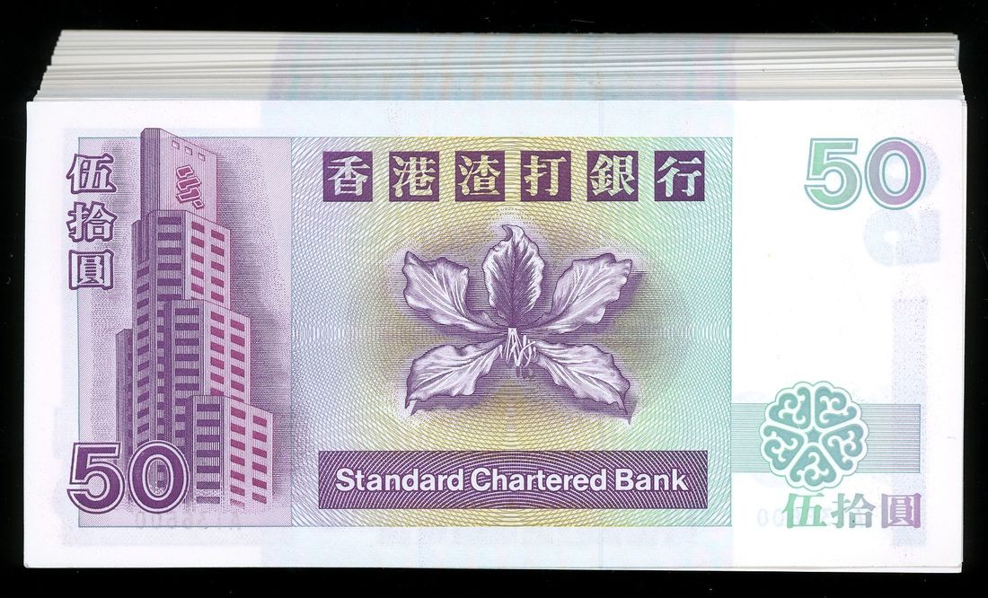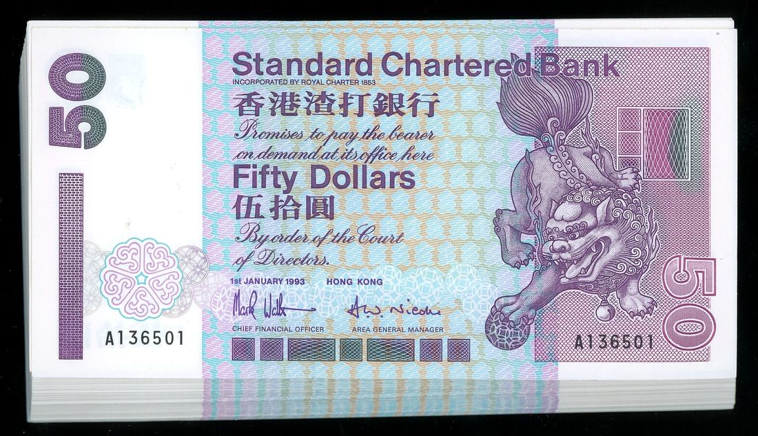 Standard Chartered Bank, Hong Kong, consecutive bundle of 100x $50, 1.1.1993, serial numbers A136501-600, (Pick 263a), first and last note with handling, otherwise uncirculated (100)