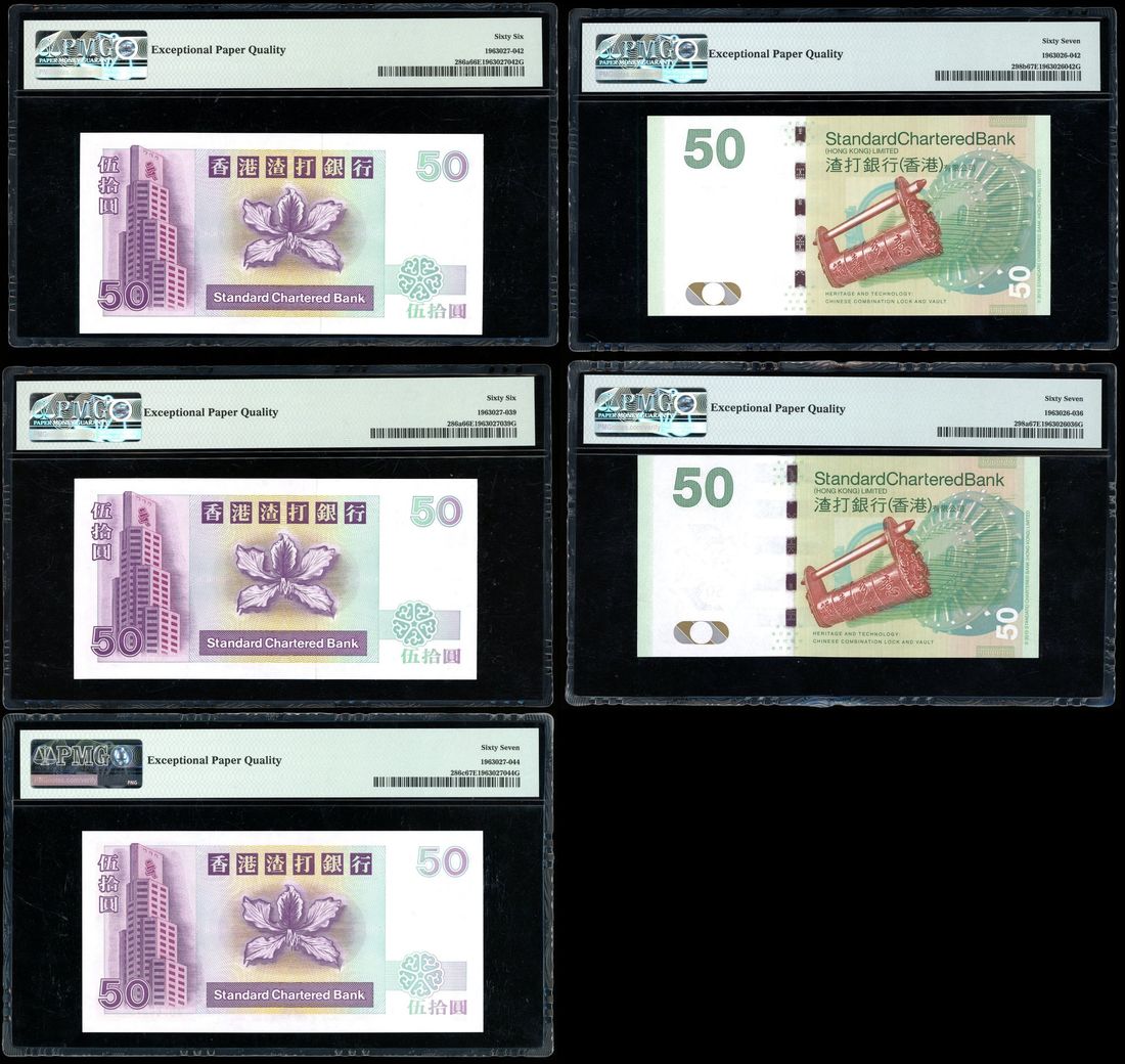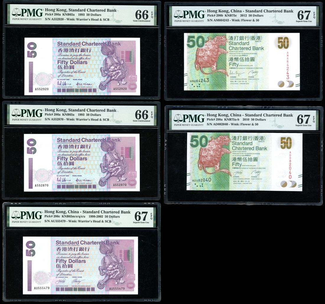 Standard Chartered Bank, Hong Kong, a group of 5x $50, including 1993 (2), 2002 (1), 2010 (1), 2012 (1), (Pick 286a, c, 298a, b), PMG 66-67EPQ (5)