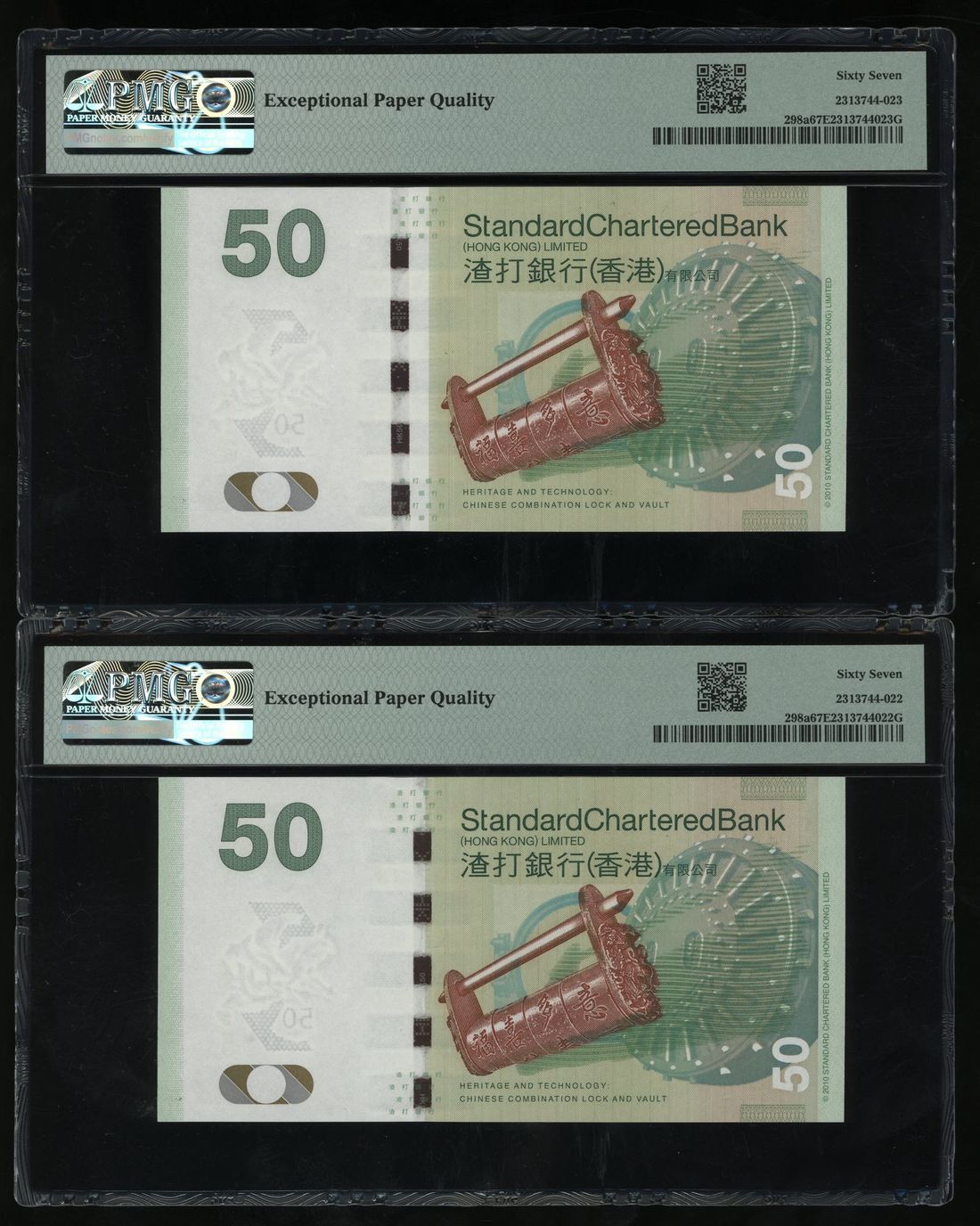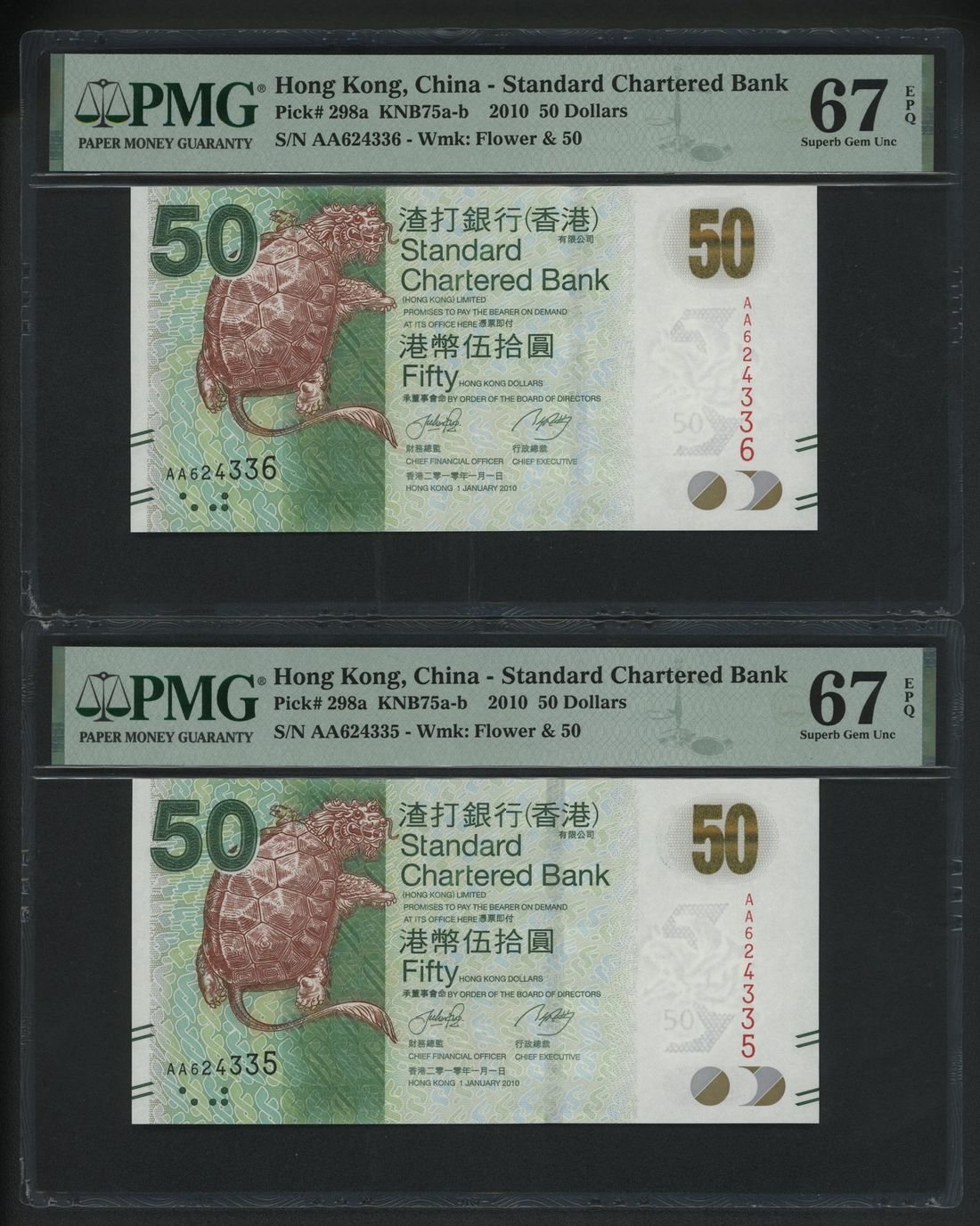 Standard Chartered Bank, Hong Kong, a consecutive pair of $50, 1.1.2010, serial numbers AA 624335-36, (Pick 298a), both graded PMG 67EPQ (2)
