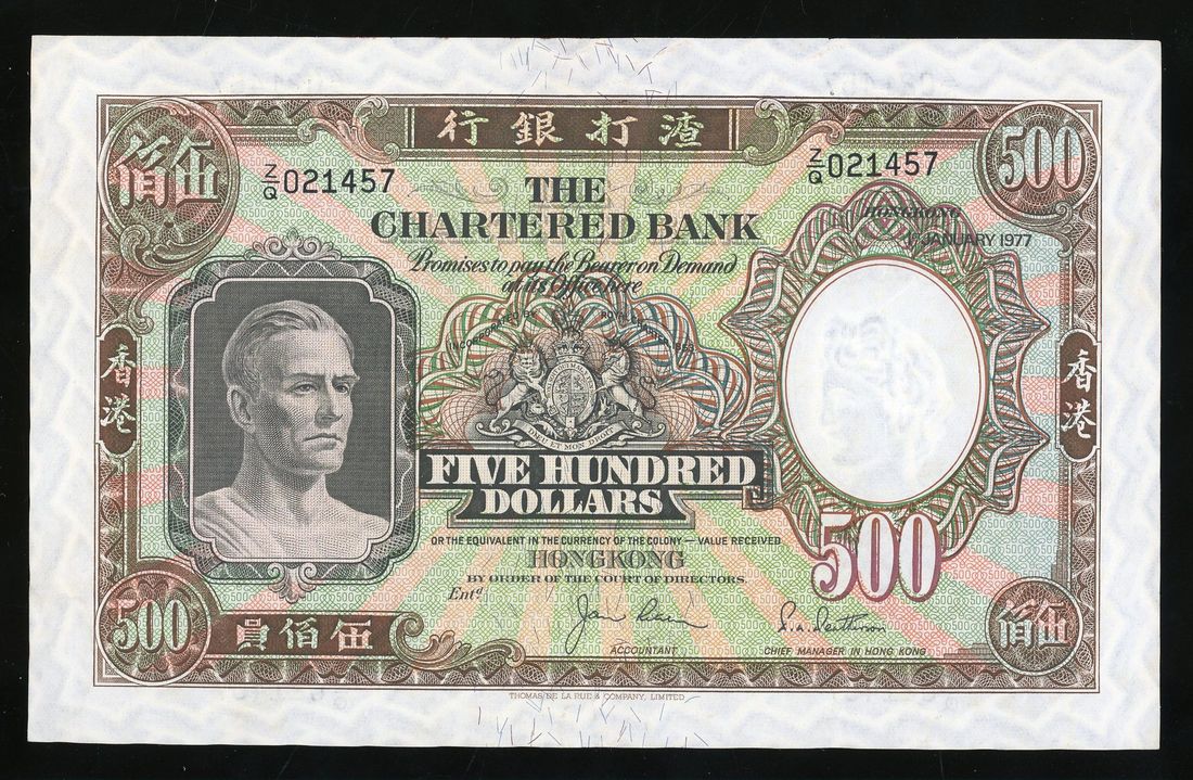 Chartered Bank, Hong Kong, $500, 1.1.1977, serial number Z/Q 021457, (Pick 72d), extremely fine