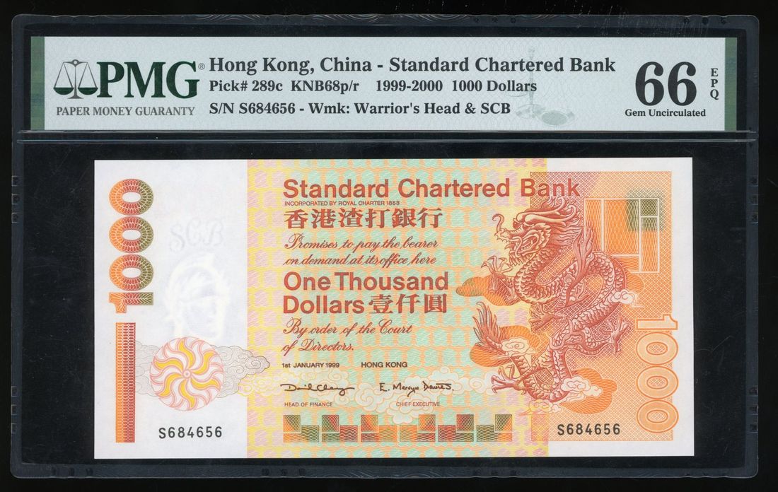 Standard Chartered Bank, Hong Kong, $1000, 1.1.1999, serial number S684656, (Pick 289c), PMG 66EPQ