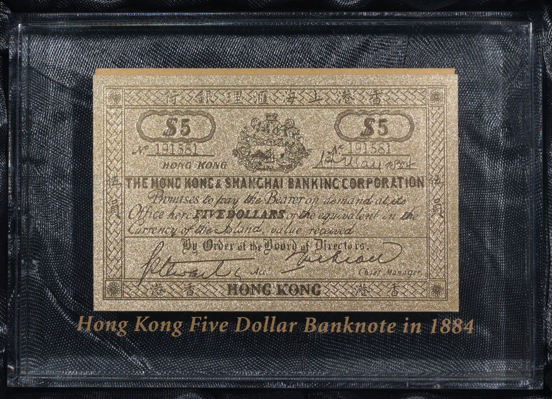 Hongkong and Shanghai Banking Corporation, gold foil $5 paperweight, 1.5.1884, serial number 191581, (Pick 137), well preserved, in original presentation case