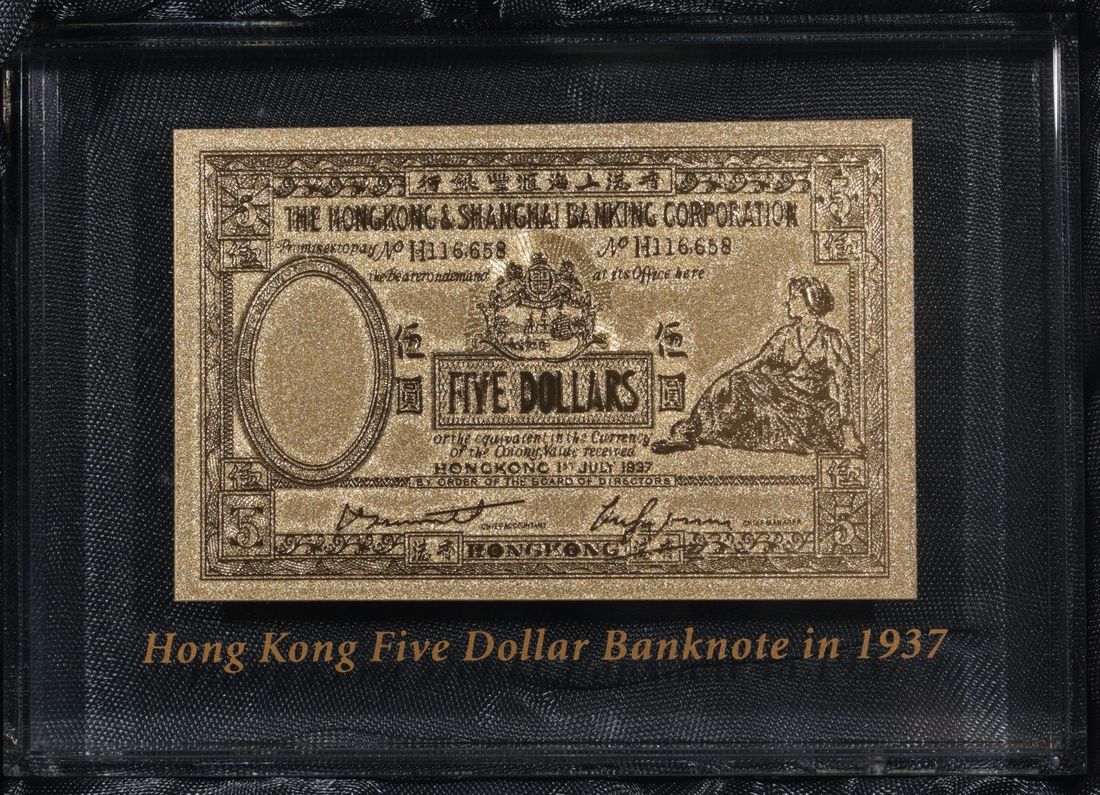 Hongkong and Shanghai Banking Corporation, gold foil $5 paperweight, 1.7.1937, serial number H 116658, (Pick 173b), well preserved, in original presentation case