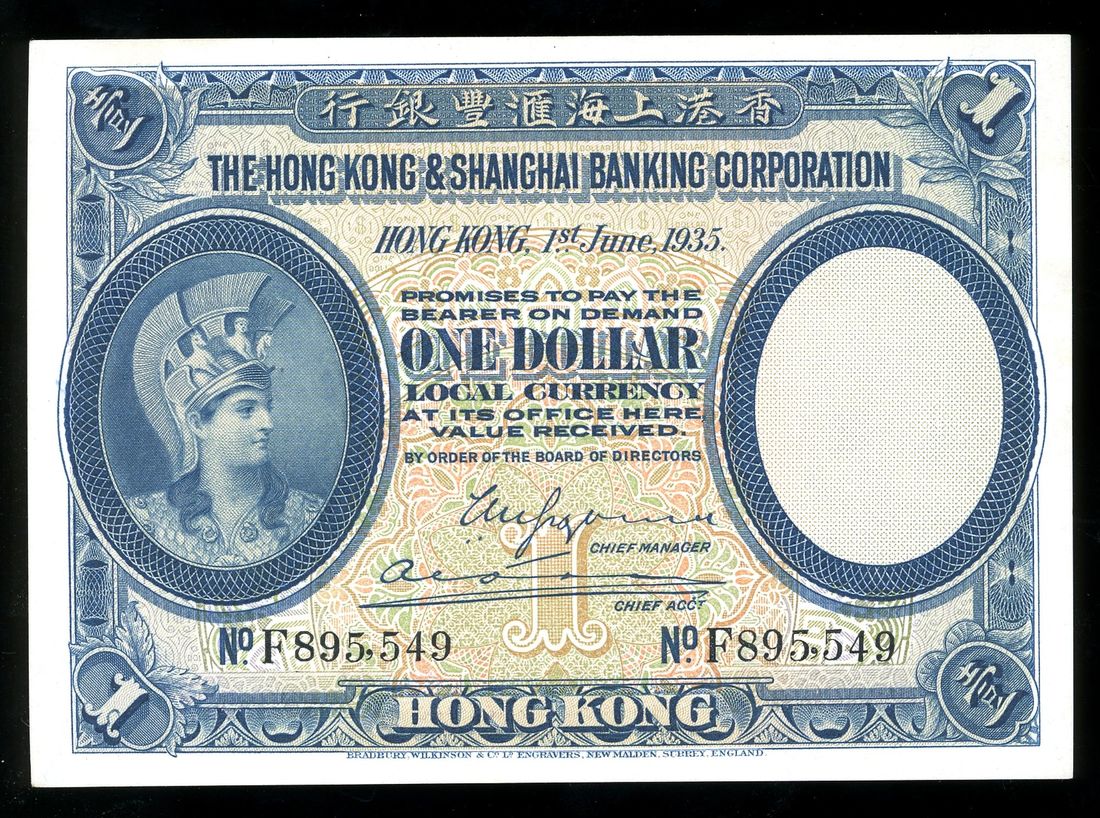 HongKong & Shanghai Banking Corporation, $1, 1.1.1935, serial number F895,549, (Pick 172c), lightly pressed, minor stain spot removal, good extremely fine and vibrant.