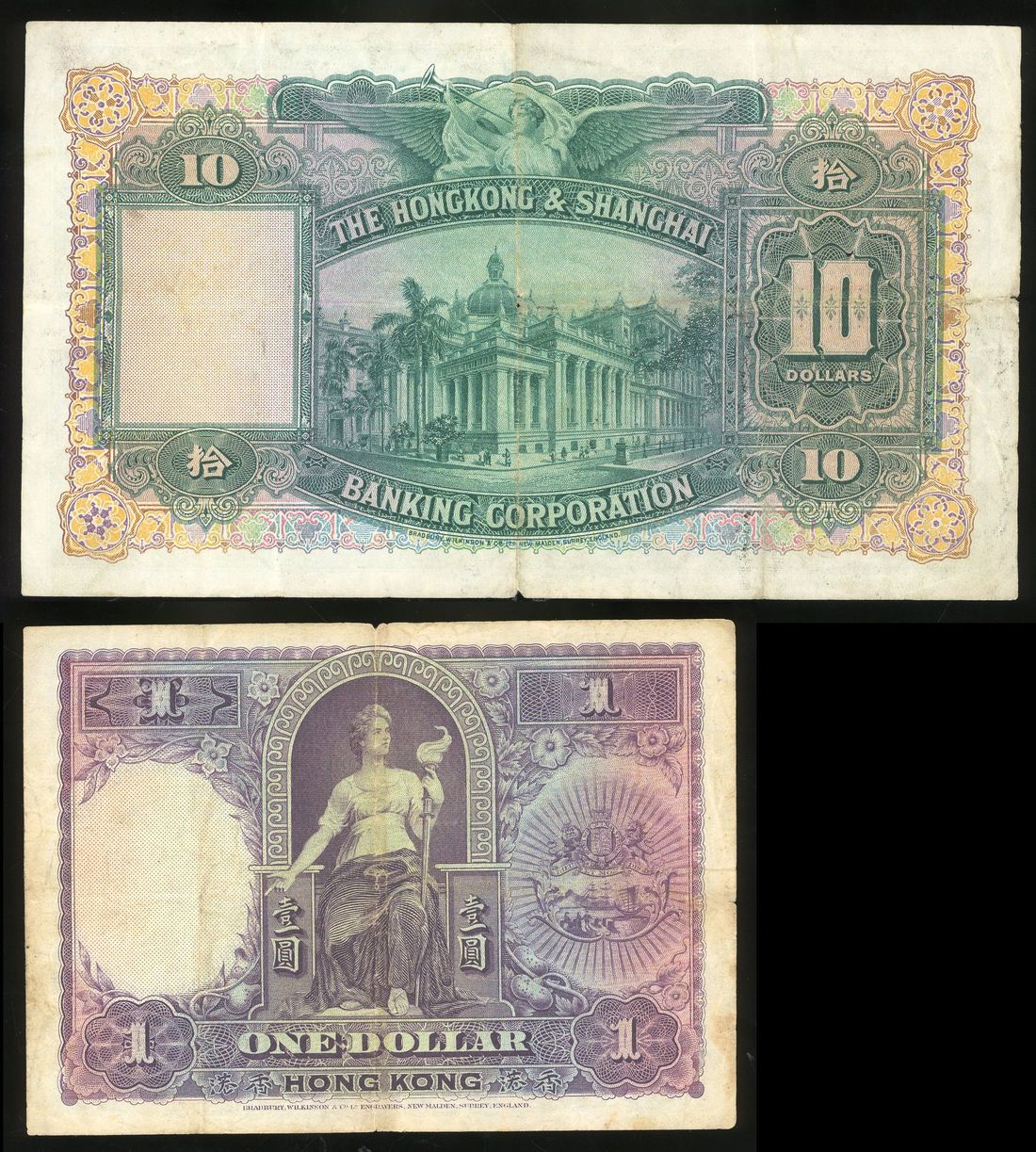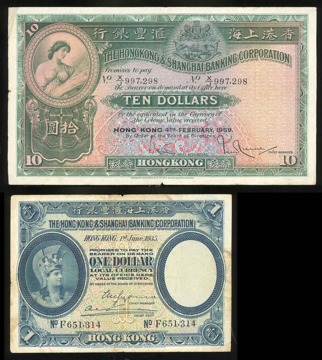 Hongkong & Shanghai Banking Corporation, $1 and $10, 1.6.1935 and 4.2.1959, serial numbers F 651314 and X/J 997298,