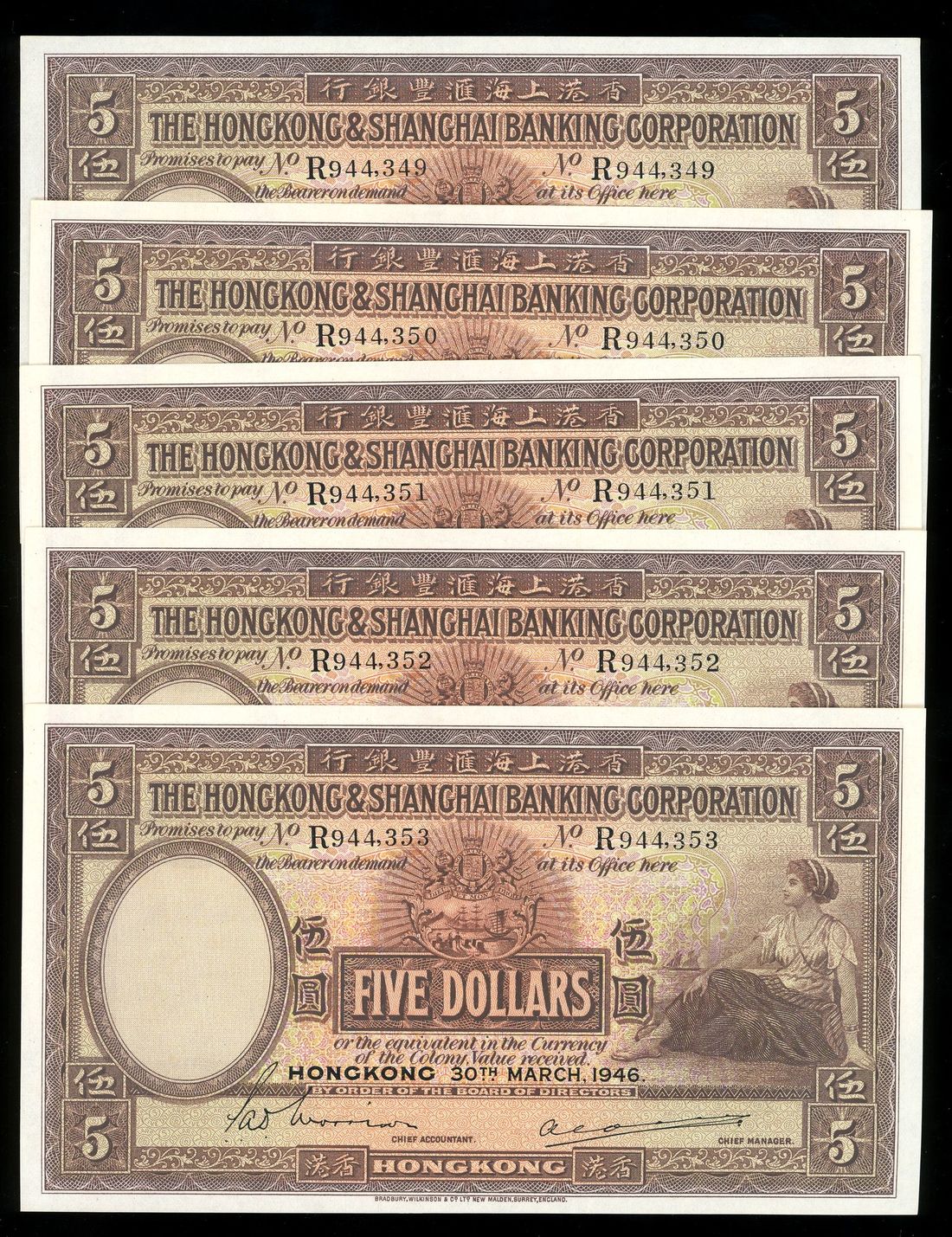 HongKong & Shanghai Banking Corporation, consecutive $5 (5), 30.3.1946, serial numbers R944,349/50/51/52/53, (Pick 173e), first prefix for year of issue, some with very minor foxing at edge, otherwise uncirculated (5)
