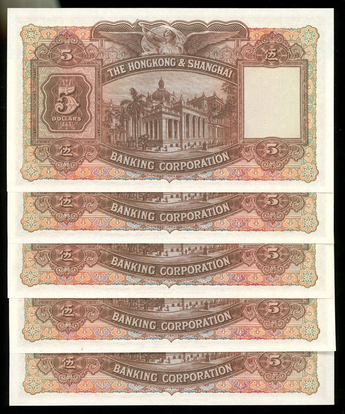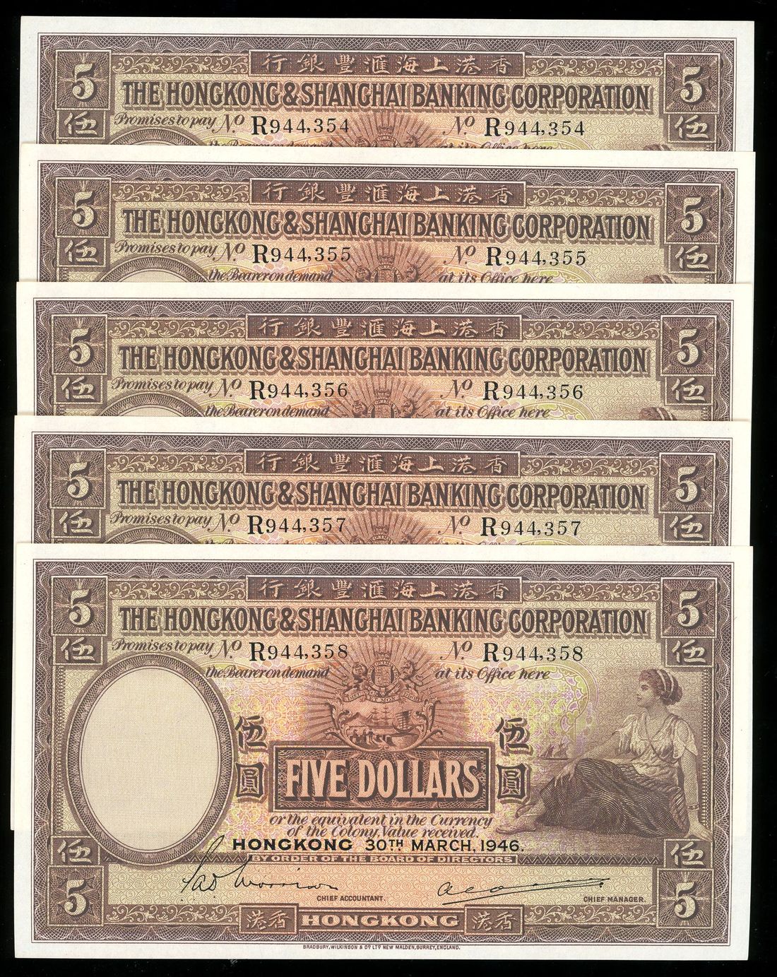 HongKong & Shanghai Banking Corporation, consecutive $5 (5), 30.3.1946, serial numbers R944,354/55/56/57/58, (Pick 173e), first prefix for year of issue, some with very minor foxing at edge, otherwise uncirculated (5)