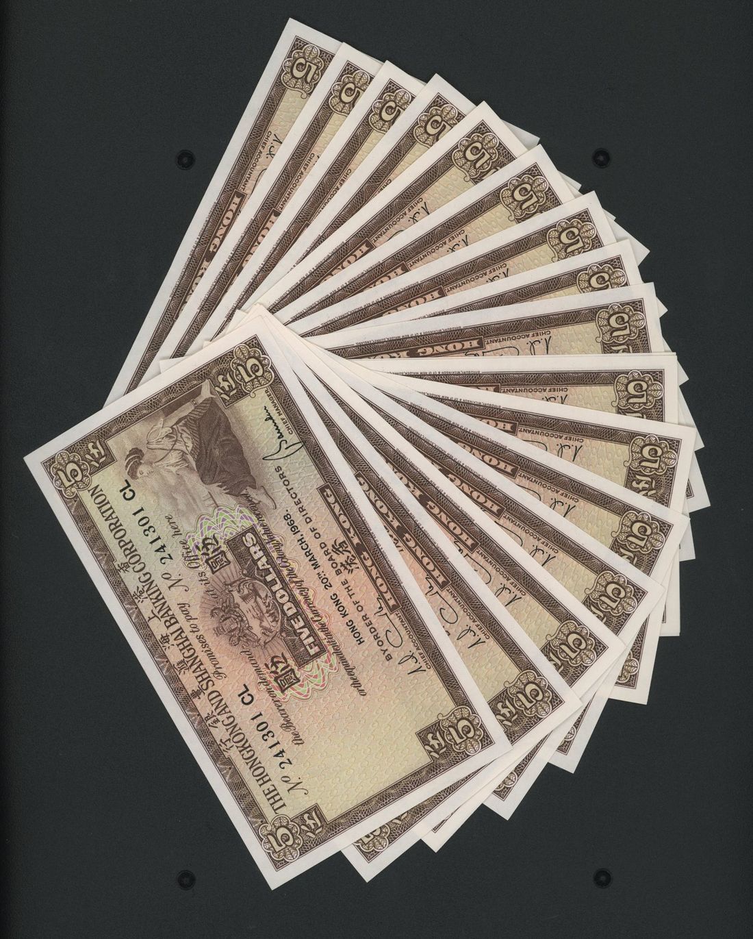 HongKong & Shanghai Banking Coproration, consecutive $5 (20), 20.3.1968, serial numbers 241301-320CL, (Pick 181), last note good EF, others all uncirculated (20)