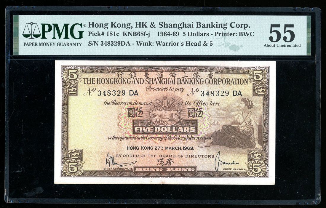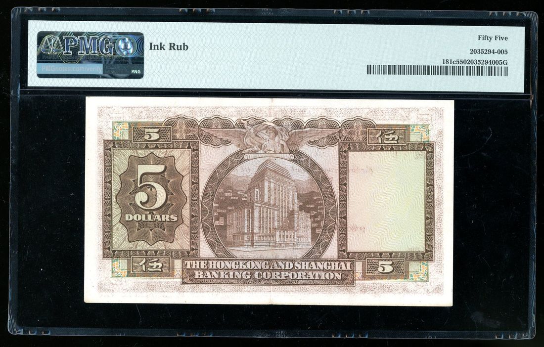Hongkong & Shanghai Banking Corporation, ERROR $5, 27.3.1969, serial number 348329 DA, ink rub on reverse, likely occurred as the sheet below had wet ink which got onto the back of this note.