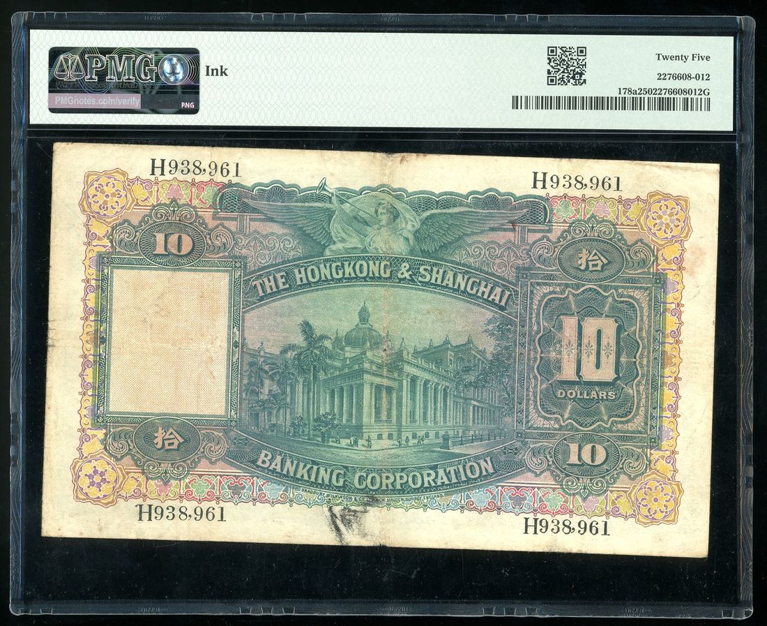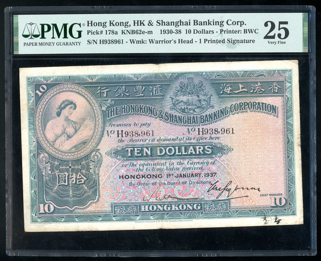 HongKong & Shanghai Banking Corporation, $10, 1.1.1937, serial number H938961, one handsigned signature,